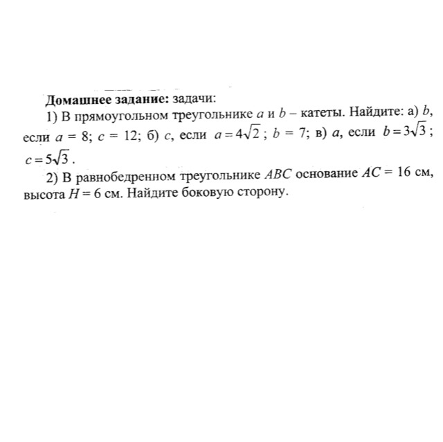 Треугольник АВС. уголС=90, 1) АС=8, АВ=12 ВС=корень(АВ в квадрате-АС в квадрате)=корень(144-64)=4*корень5, 2) АС=4*корень2, ВС=7, АВ=корень(АС в квадрате+ВС в квадрате)=корень(32+49)= 9 3) ВС=3*корень3, АВ=5*корень3, АС=корень(АВ в квадрате-ВС в квадрате)=корень(75-27)=4*корень3