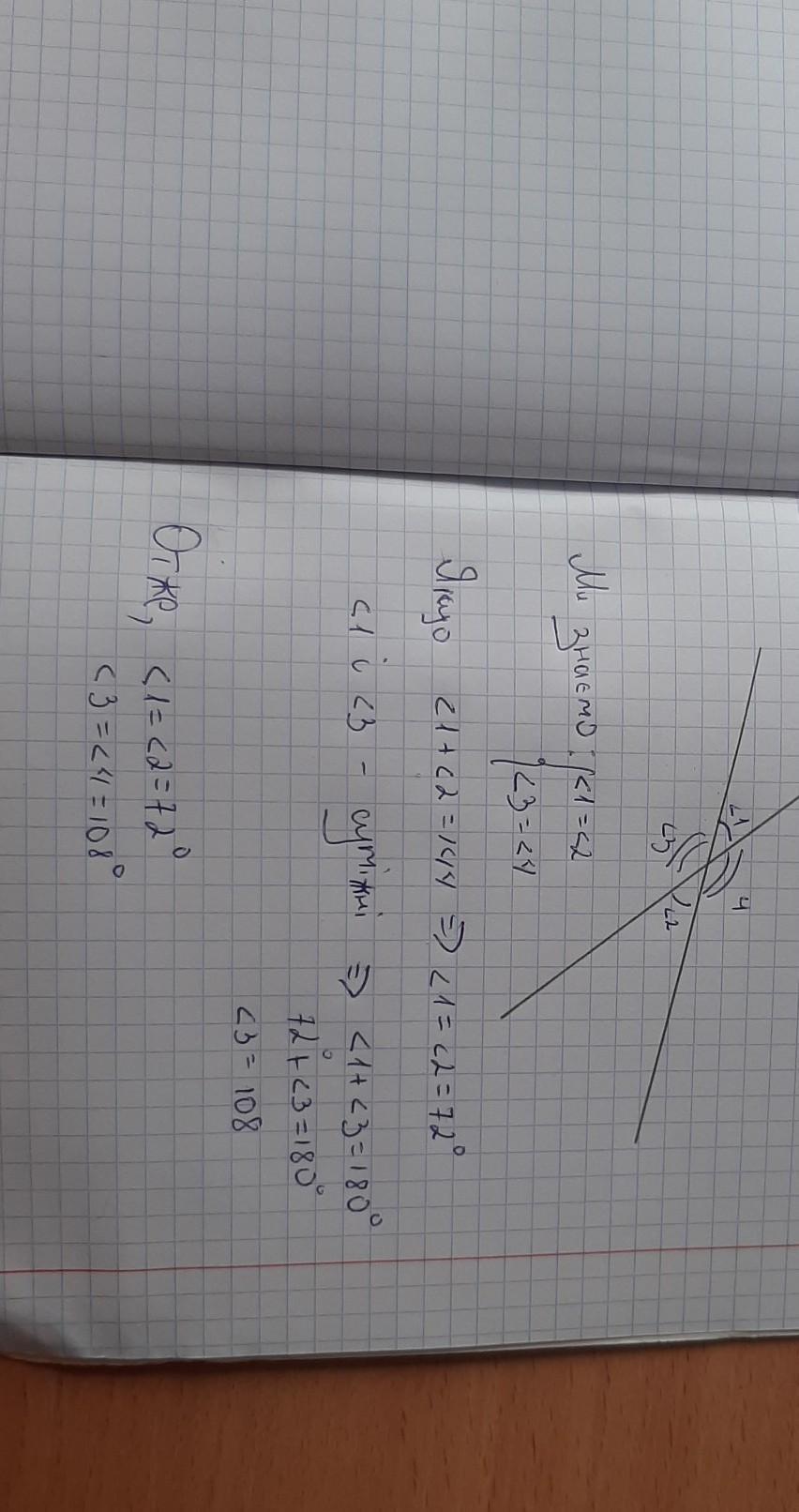 угол 1 равняется углу2 следует, и их сумма равна 144, тогда угол 1 и угол 2 =72°, так как угол 1 "сумiжний" с углом 3, а за теоремой их сумма = 180, следует,что угол 3=угол 4=180-72=108