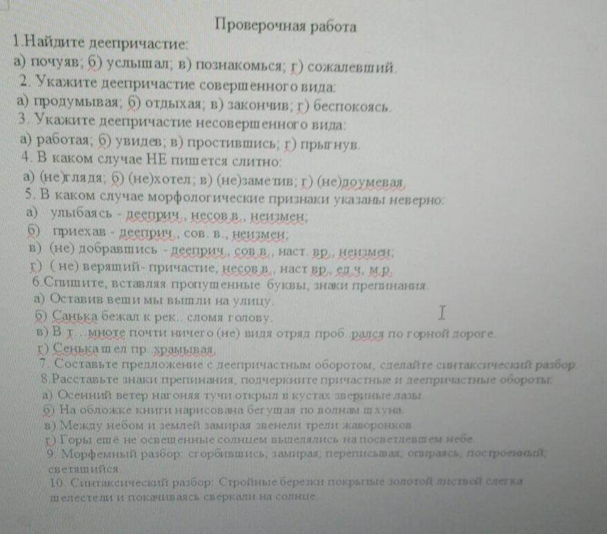 6. А) Оставив вещи, мы вышли на улицу. Б) Санька бежал к реке, сломя голову. В) В темноте, почти ничего не видя, отряд пробирался по горной дороге. Г) Сенька шел, прихрамывая.