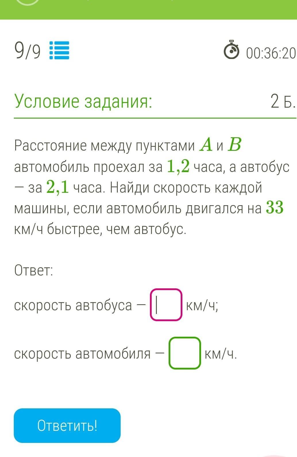 Ответ: скорость автобуса равна 44 км/ч, а скорость машины равна 77 км/ч