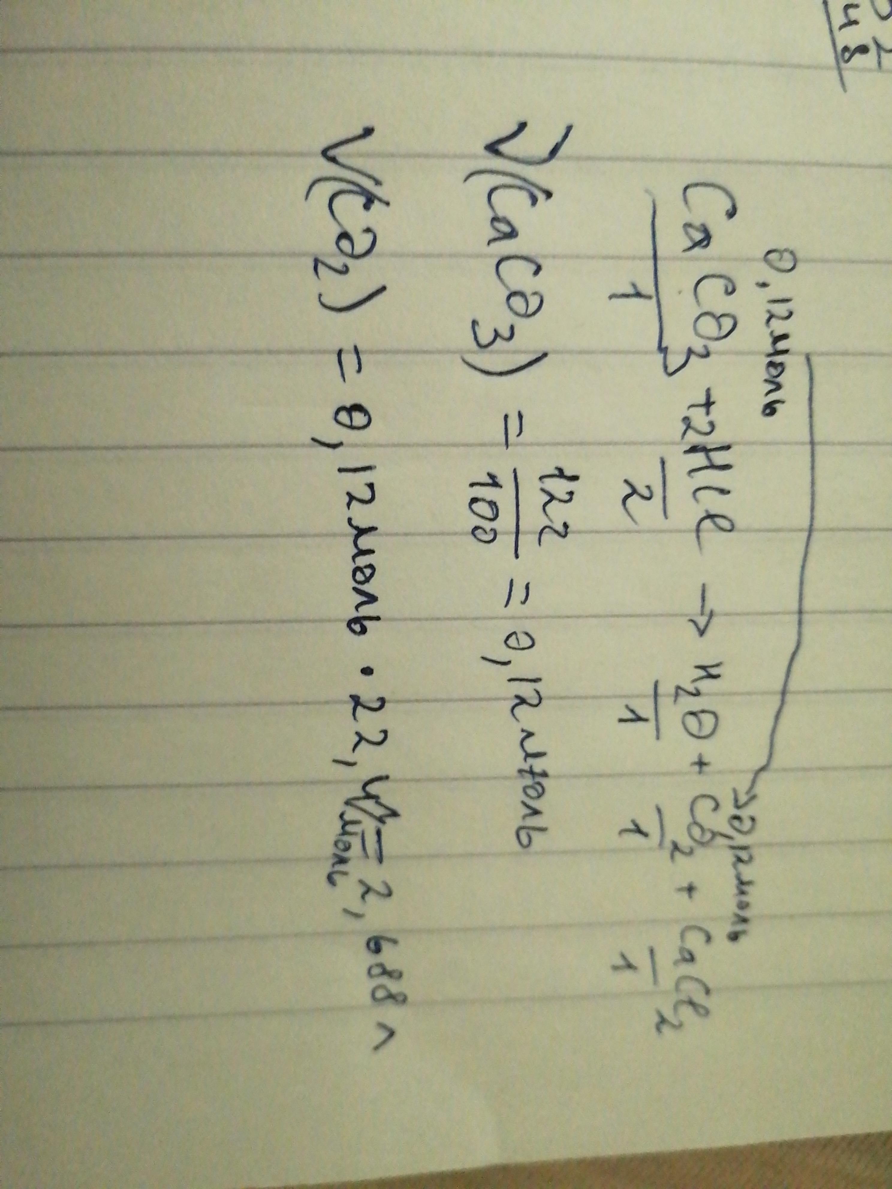 Какой объем углекислого газа образуется, если к карбонату кальция массой 12г прилить соляную кислоту ???
