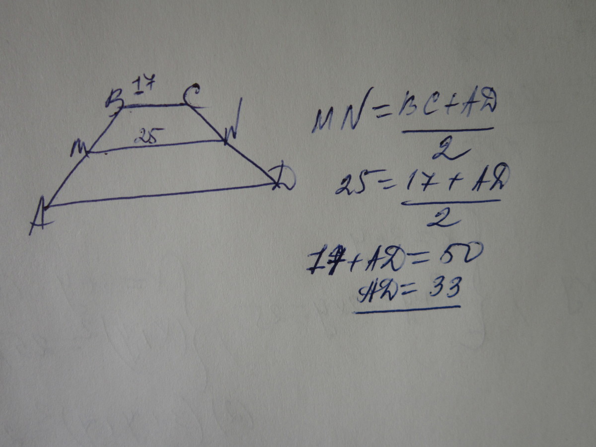 Средняя линия трапеции равна 25 , а меньшее основание равно 17 . Найдите большее основание трапеции.