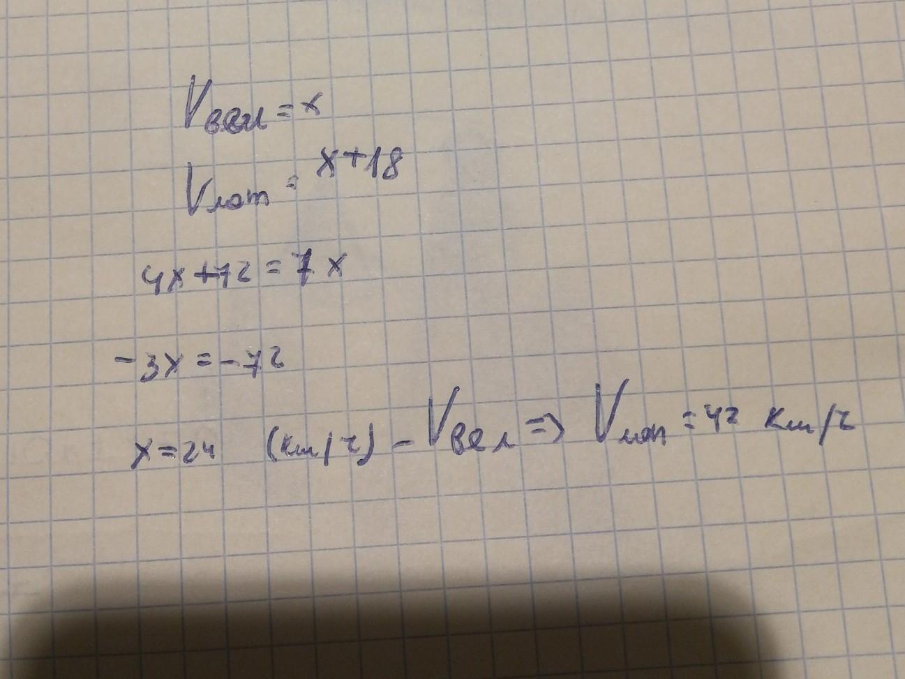 «Расстояние между городами мотоциклист проехал за 4 ч., а велосипедист проехал за 7 ч. Скорость велосипедиста на 18 км/ч меньше скорости мотоциклиста. Вычисли скорости велосипедиста и мотоциклиста и расстояние между городами».