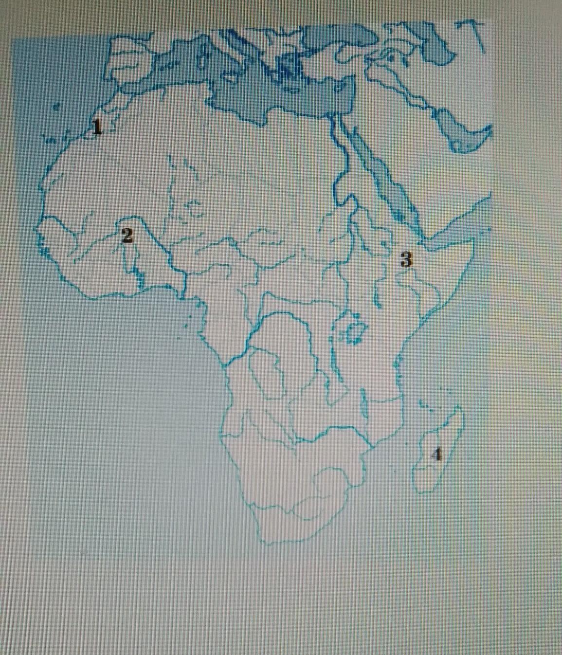 выбери цифру, которой на картосхеме Африкм обозначено место, где лето жаркое и засушливое, а зима теплая и влажная