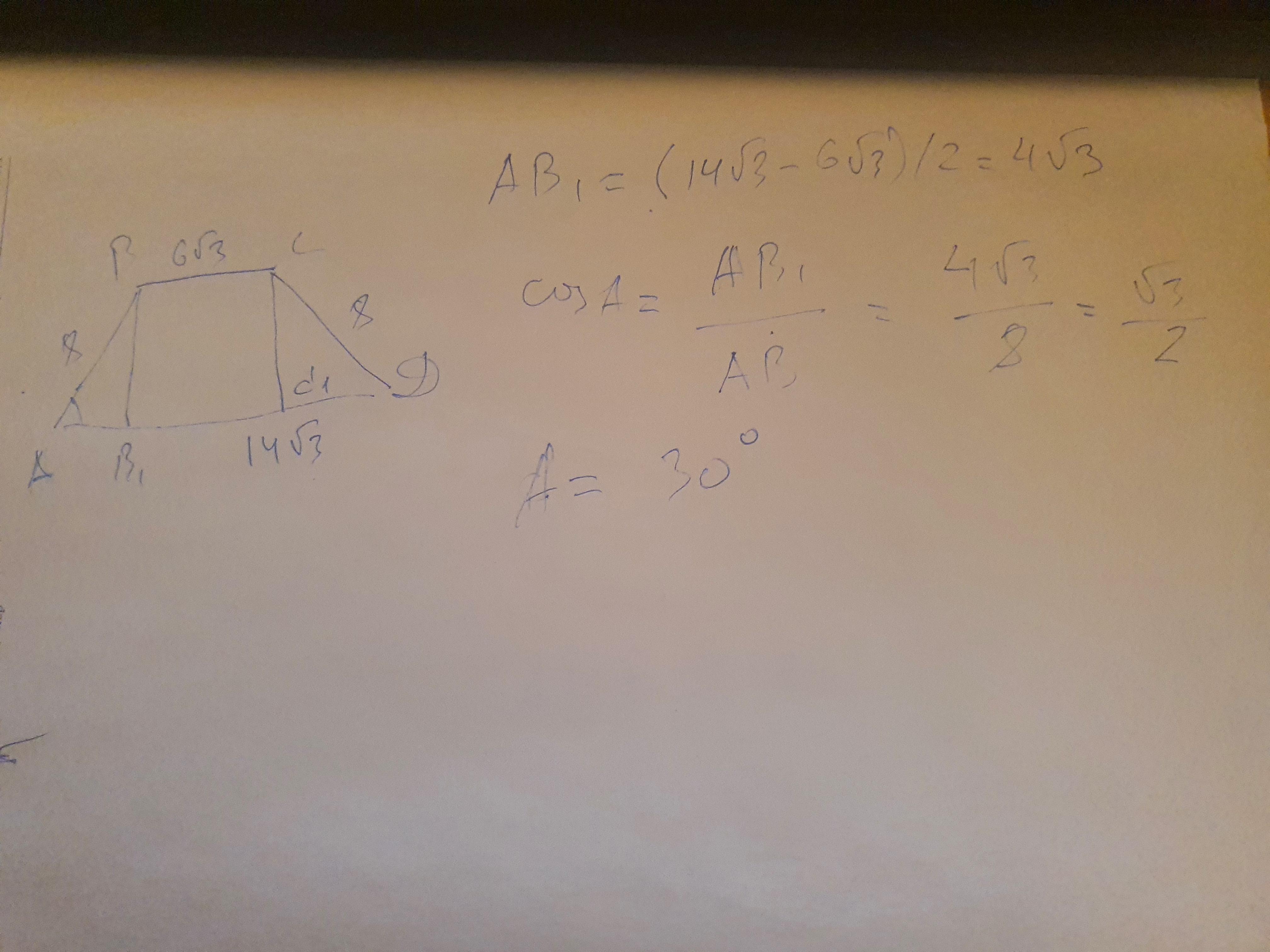 В трапеции АВСД сторона АВ = СД = 8 см. сторона ВС =6√3 см, сторона АД = 14√3 см. Найдите острый угол трапеции.(в ответ запишите только число)