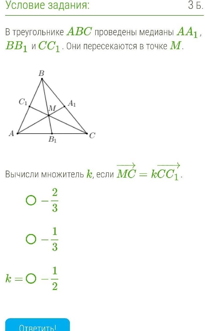С решением, В треугольнике ABC проведены медианы AA1, BB1 и CC1. Они пересекаются в точке M.