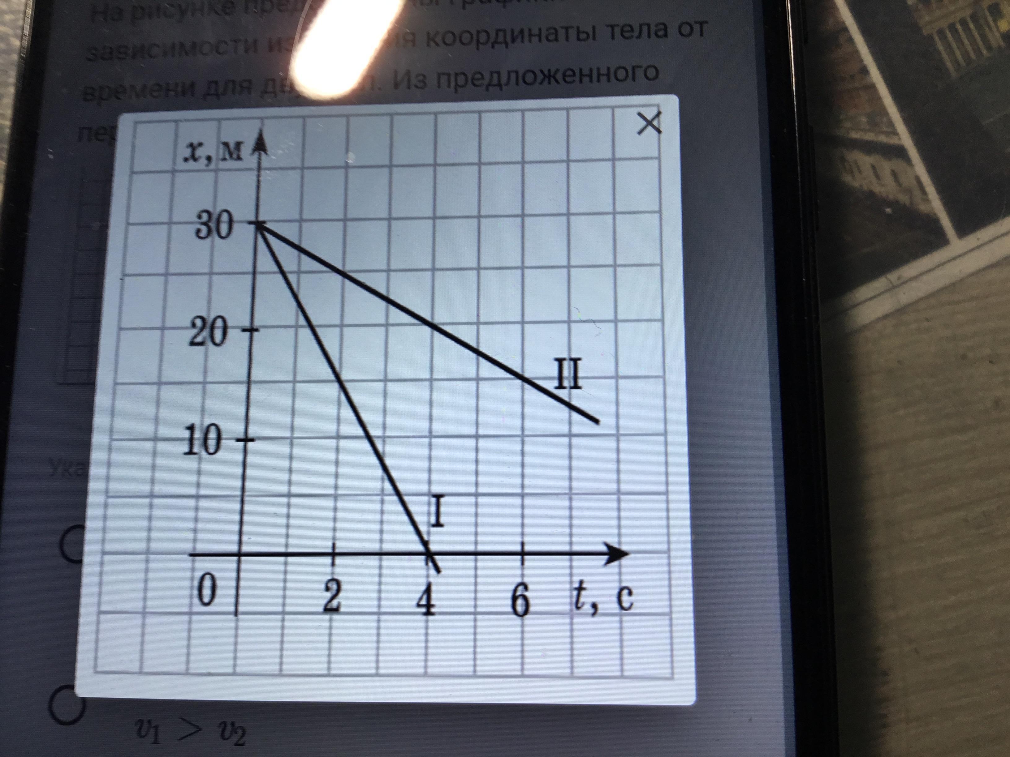 На рисунке представлены графики зависимости изменение координаты тела от времени для двух тел. Из предложенного перечня выберите верное утверждение.
