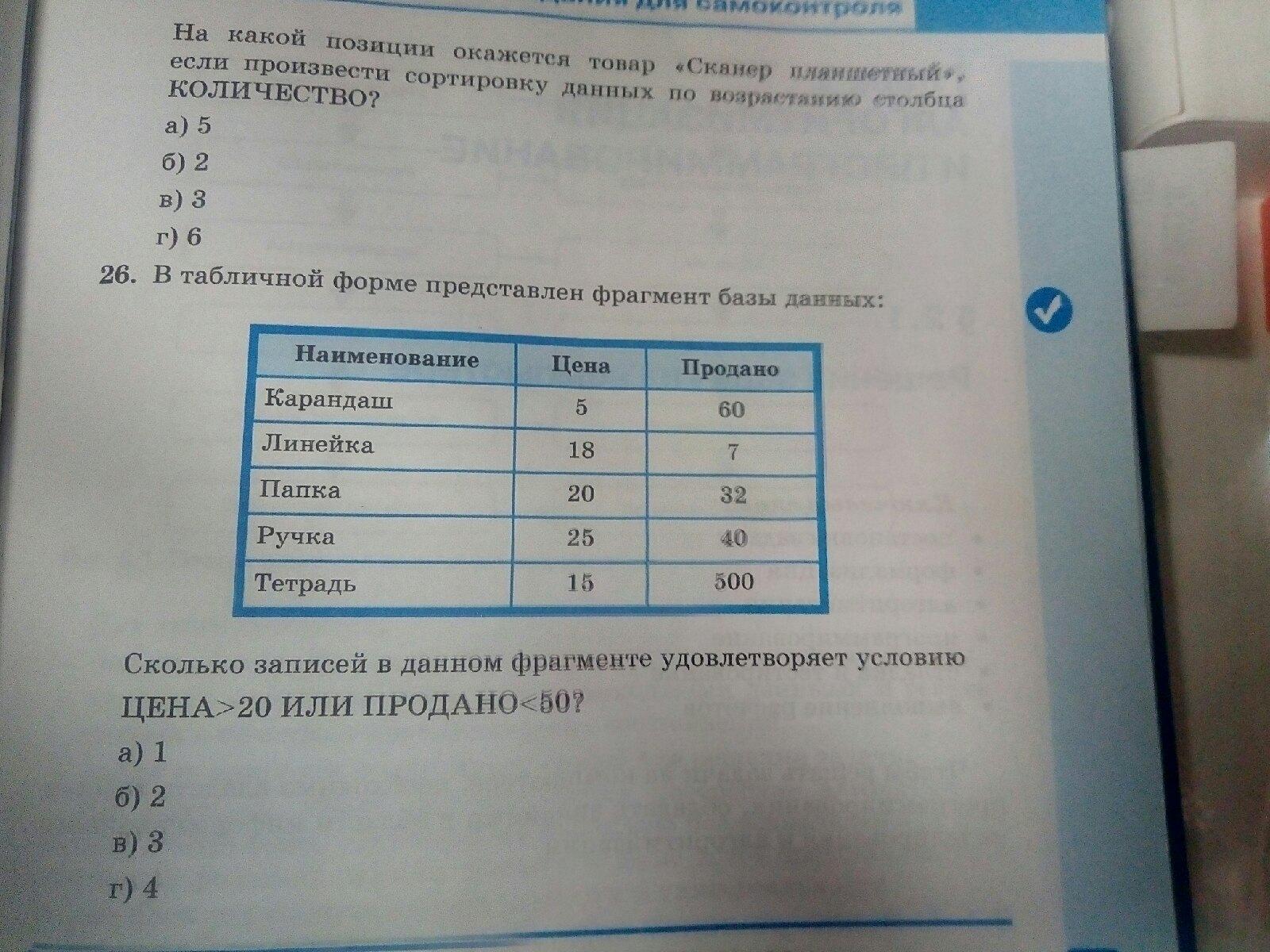 26. Союз ИЛИ означает, что нас устроит истина одного любого условия или их обоих. Т.е. достаточно,чтобы выполнилось условие цена>20, чтобы запись подошла, или же только продано<50, или их одновременное выполнение. Тогда подойдет карандаш(продано), ручка (цена), тетрадь(продано). Итого 3. Ответ в. (Папка не подойдёт т.к. условие цена>20, а 20 не больше 20, если бы было больше или равно, то подошло)