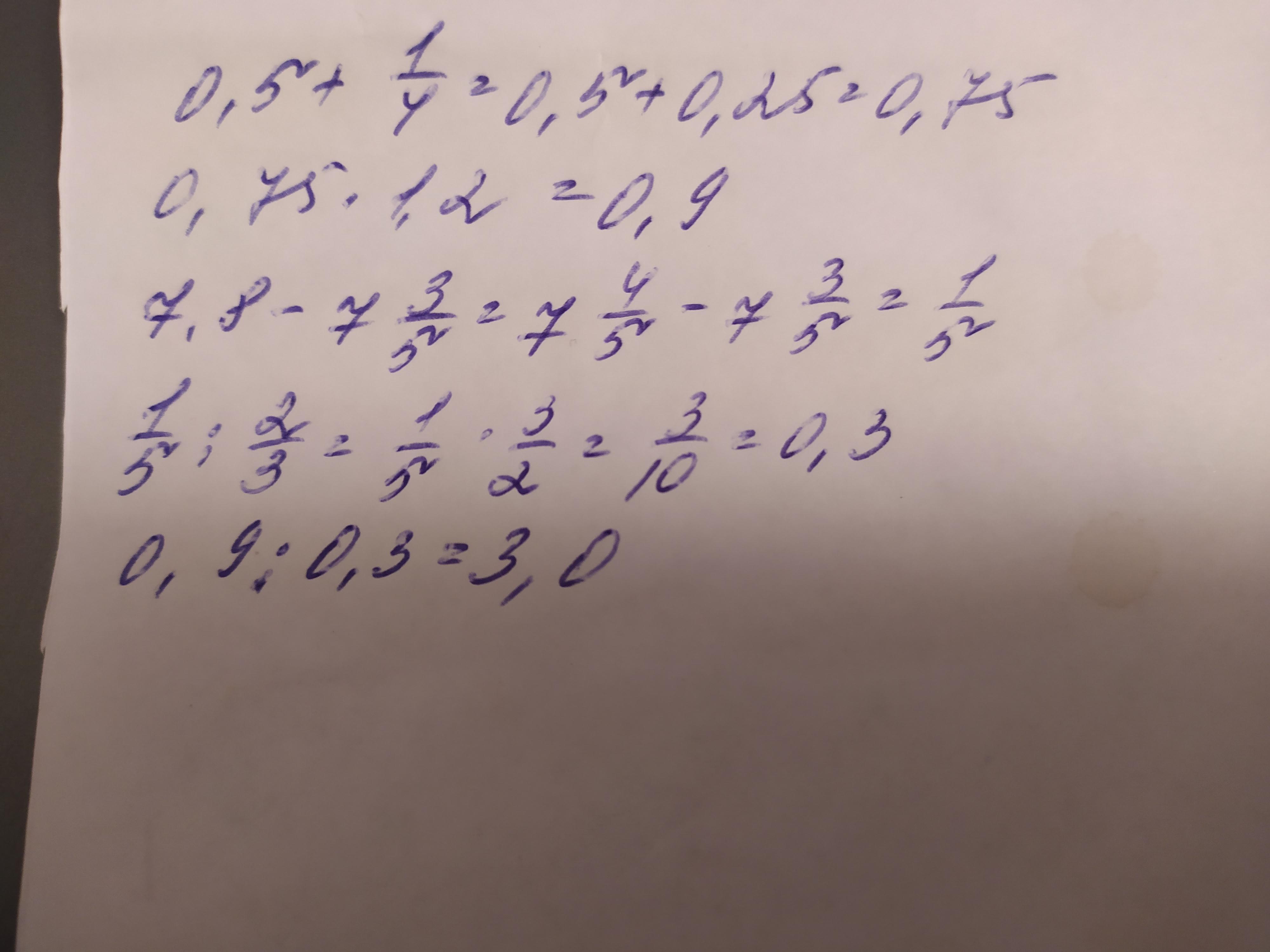 (7,8 - 7 3/5) : 2/3 (7 4/5 - 7 3/5) : 2/3 1/5 * 3/2 3/10 0,3