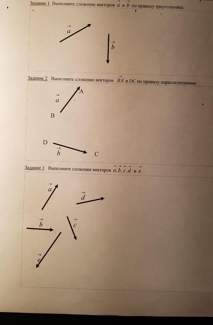 1) откладываешь от произвольной точки вектор а , затем от конца вектора а откладываешь вектор б, потом из начала вектора а ведёшь вектор к концу вектора б, это и будет вектор суммы по правилу треугольника