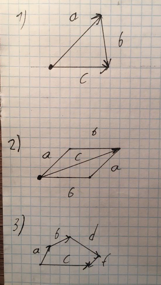 3) из произвольной точки откладываешь первый вектор, из его конца второй, затем из конца второго третий и так до последнего, потом ведёшь вектор из начальной точки к концу последнего(по сути как и в первом примере но векторов больше) и это и будет вектор суммы