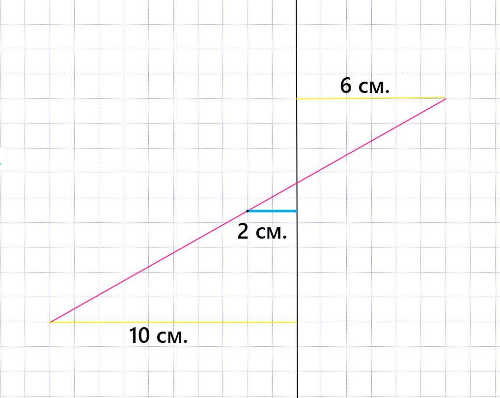Середина высот: (6+10)/2=8 см., но на прямой лежит не конец отрезка, а прямая отрезок пересекает, поэтому нужно отнять смещение, которое равно меньшей высоте (6 см.):