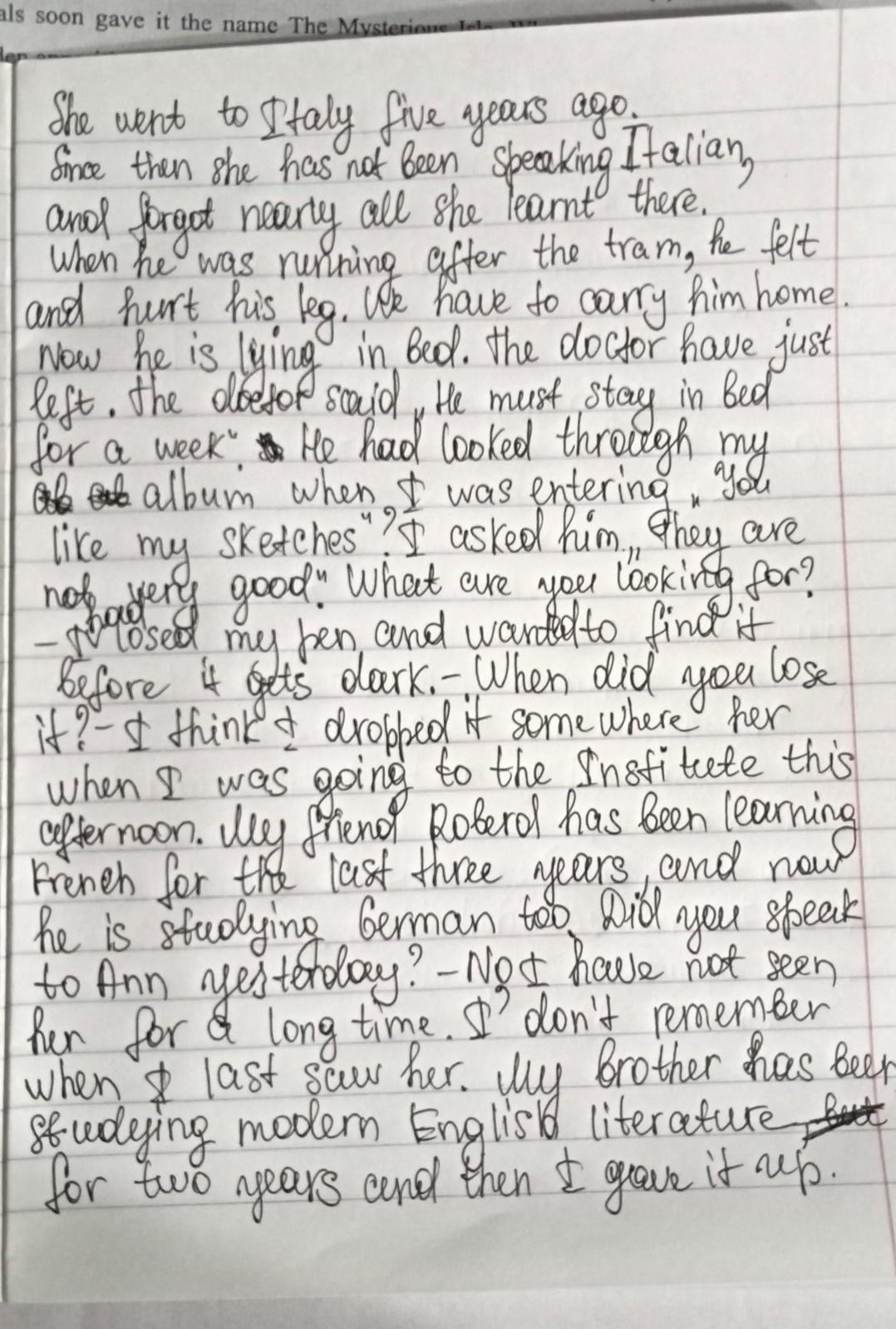 . She (to go) to Italy five years ago. Since then she (not to speak) Italian, and (to forget) nearly all she (tolearn) there. 2. When he (to run) after the tram, he (to fall) and (to hurt) his leg. We (to have) to carry himhome. Now he (to lie) in bed. The doctor just (to leave). The doctor (to say) he must stay in bed for a week. 3.He (to look) through my album when I (to enter). "You (to like) my sketches?" I (to ask) him. "They (not to be)very good." 4. What you (to look) for? - I (to lose) my pen and (to want) to find it before it (to get) dark. -When you (to lose) it? - I (to think) I (to drop) it somewhere here when I (to go) to the Institute this afternoon. 5. My friend Robert (to learn) French for the last three years, and now he (to study) German, too. 6. You (tospeak) to Ann yesterday? - No, I (not to see) her for a long time. I (not to remember) when I last (to see) her. 7.My brother (to study) modern English literature for two years and then (to give) it up. 8. I (to look) at thisphotograph for five minutes, but I can't see you in it. - I'm afraid you (to look) at the wrong one. 9. You muststop reading; you have a headache because you (to read) too long! 10. My elder brother (to join) the army whenhe (to be) eighteen. 11. They (to live) in that town for ten years and then (to move) to the country. 12. We (tolive) here for the last six months, and just (to decide) to move. 13. He (to write) a new play for the last twoyears, but he (not to finish) it yet