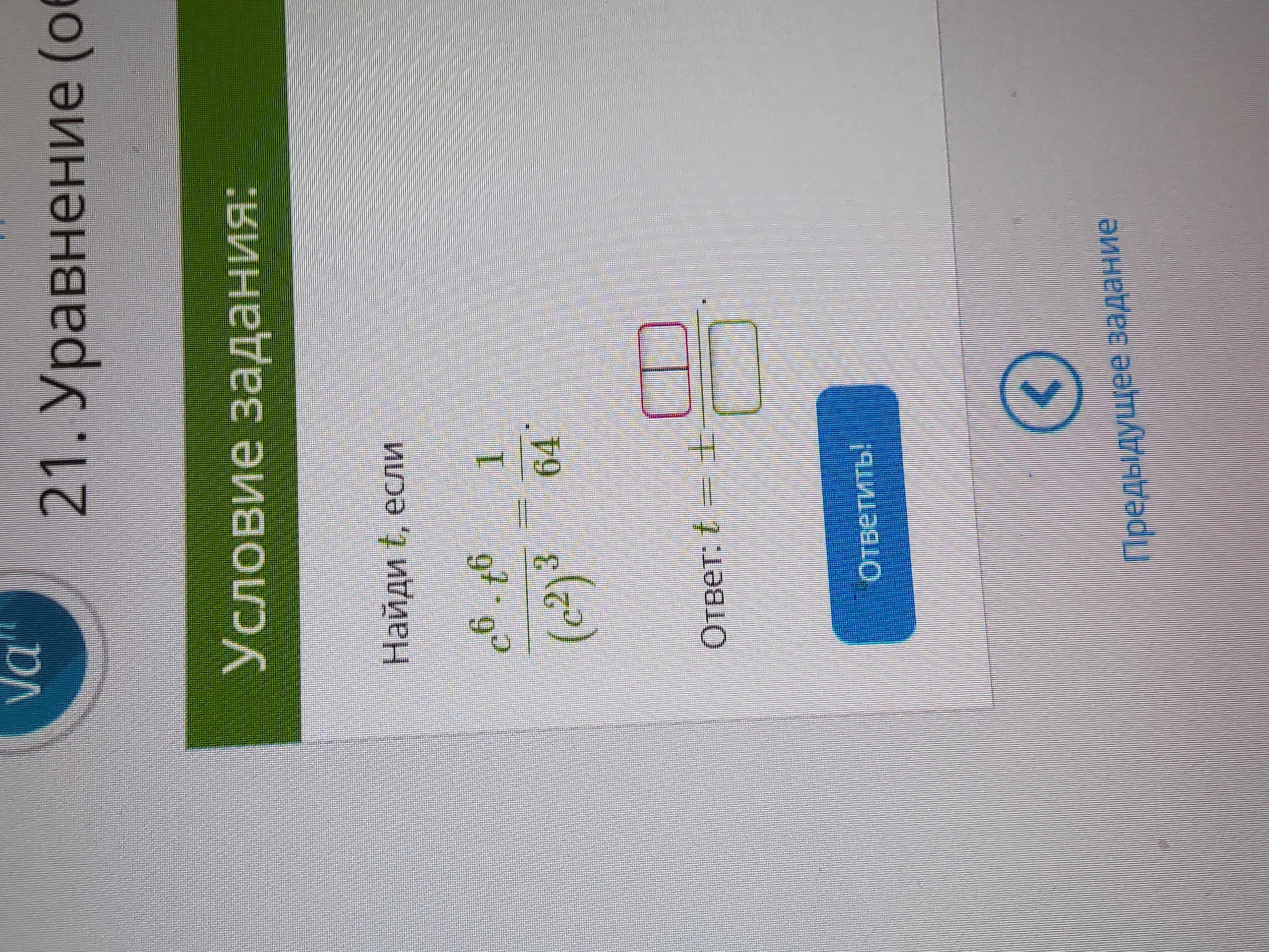 2)\ \ \dfrac{c^6\cdot t^6}{(c^2)^3}=\dfrac{1}{64}\\\\\\\dfrac{c^6\cdot t^6}{c^6}=\dfrac{1}{2^6}\\\\t^6=\dfrac{1}{2^{6}}\\\\|t|=\dfrac{1}{2}\\\\t=\pm \dfrac{1}{2}