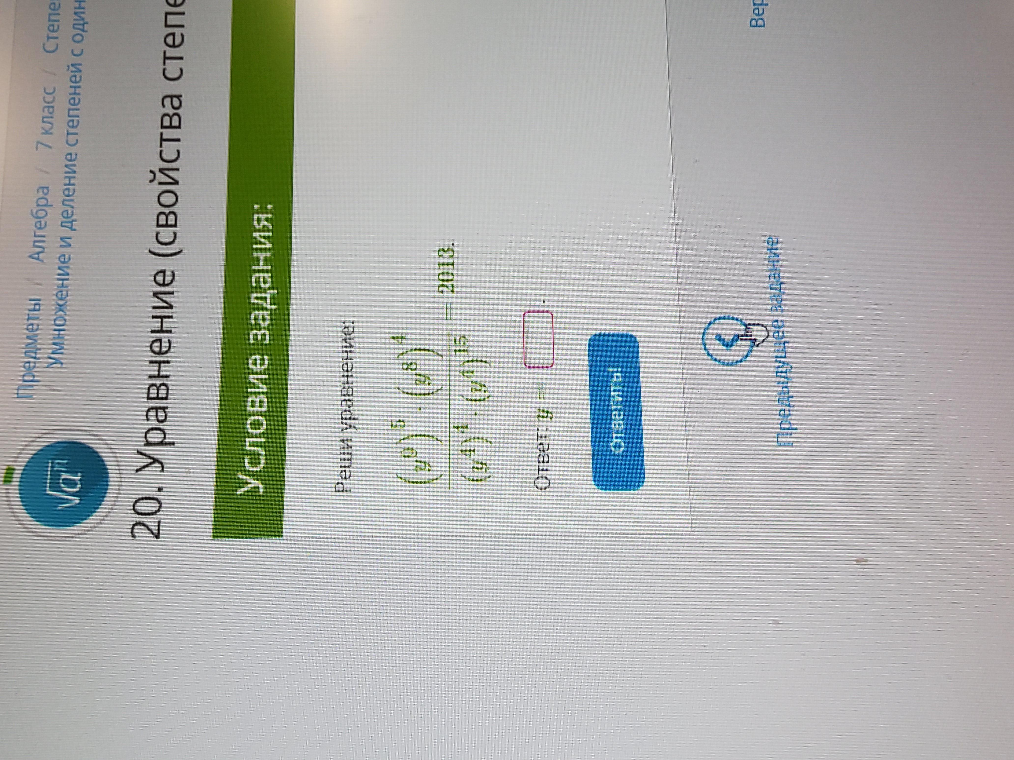 1)\ \ \dfrac{(y^9)^5\cdot (y^8)^4}{(y^4)^4\cdot (y^4)^{15}}=2013\\\\\\\dfrac{y^{45}\cdot y^{32}}{y^{16}\cdot y^{60}}=2013\\\\\\\dfrac{y^{77}}{y^{76}}=2013\\\\\\y=2013