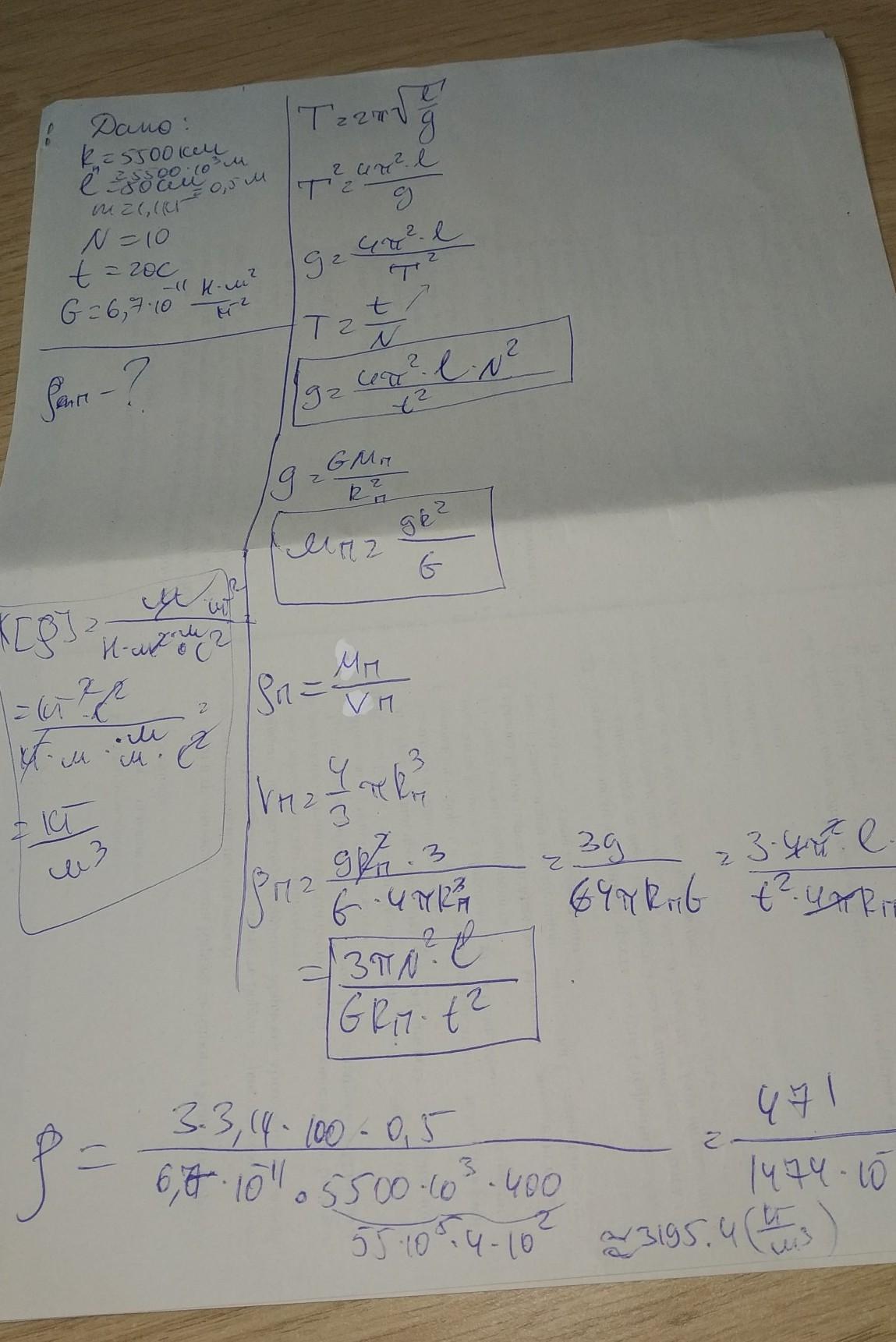 Космический путешественник прилетел на звездолете на экзопланету радиуса R=5500 км. Привязав к нити длиной l=50 см маленький камень массой m=1.1 кг, путешественник получил маятник. Он измерил время 10 полных колебаний маятника в разных точках поверхности экзопланеты. Во всех точках время получилось одинаковым t=20 с. Чему равна средняя плотность планеты? Гравитационная постоянная равна G = 6,7⋅10^(−11) Н⋅м^2⋅кг^(-2).