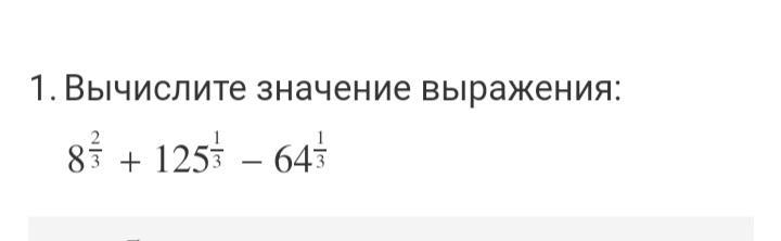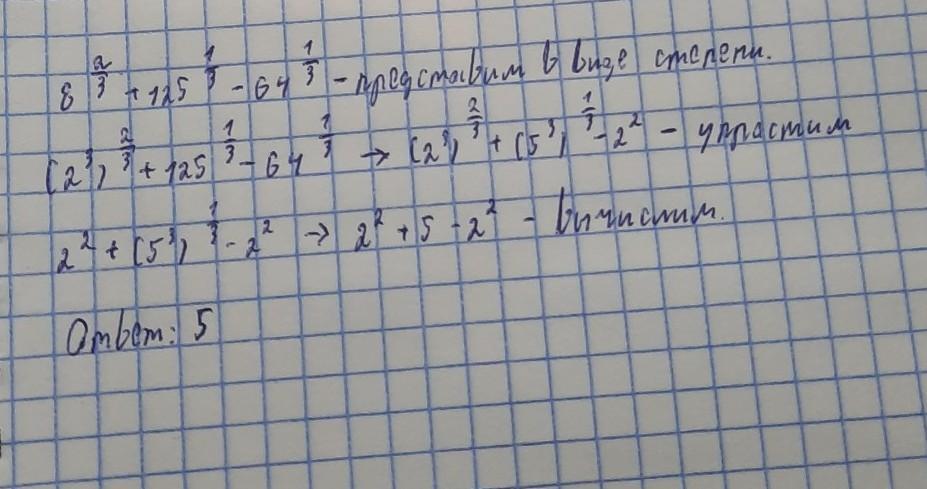 8^(2/3)+125^(1/3)-64^(1/3)= (2³)^2/3+(5³)^1/3-(4³)^1/3= 2^(3*2/3)+5^(3*1/3)-4^(3*1/3)= 2²+5¹-4¹=4+5-4=5