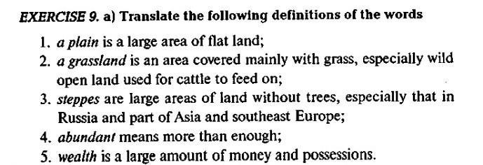 Равнина - это большая площадь равнины 2. Пастбища - это территория, покрытая в основном травой, особенно дикая открытая земля, используемая для кормления скота. 3. степи - это большие участки земли без деревьев, особенно в России и в части Азии и юго-восточной Европы. 4. изобилие означает более чем достаточно. 5. Богатство - это большие деньги и владение.