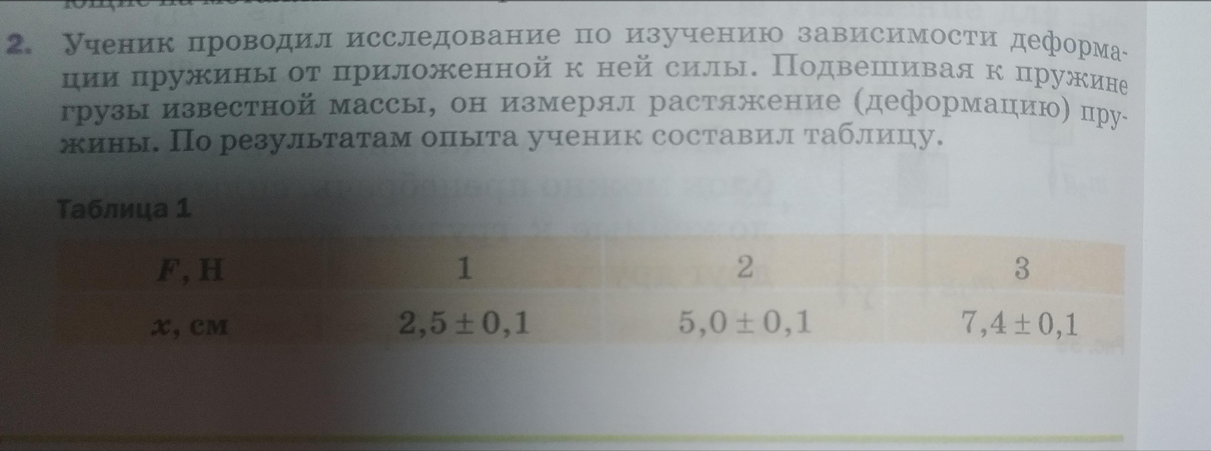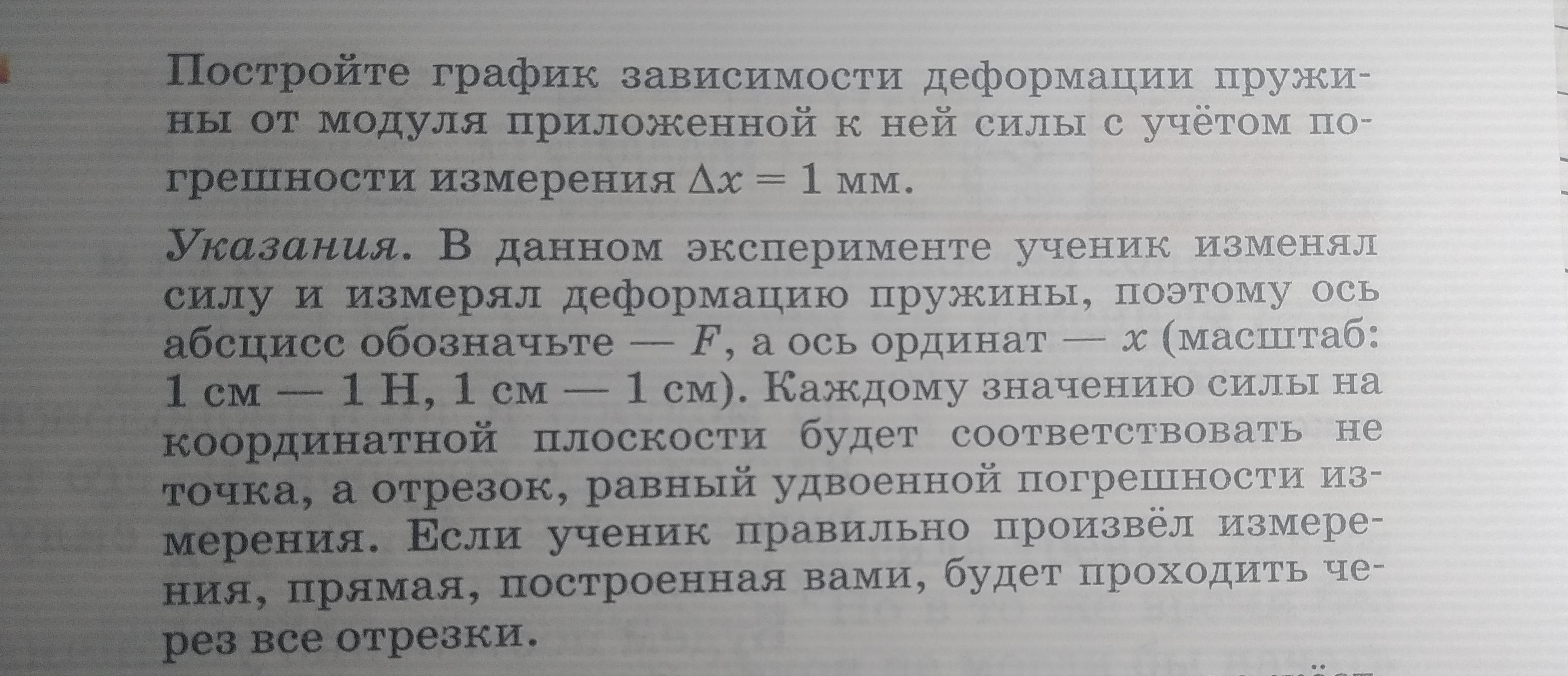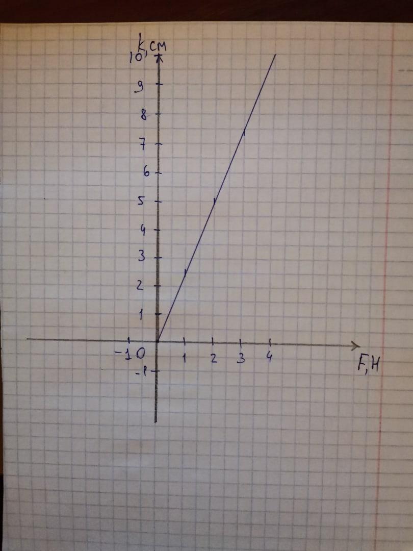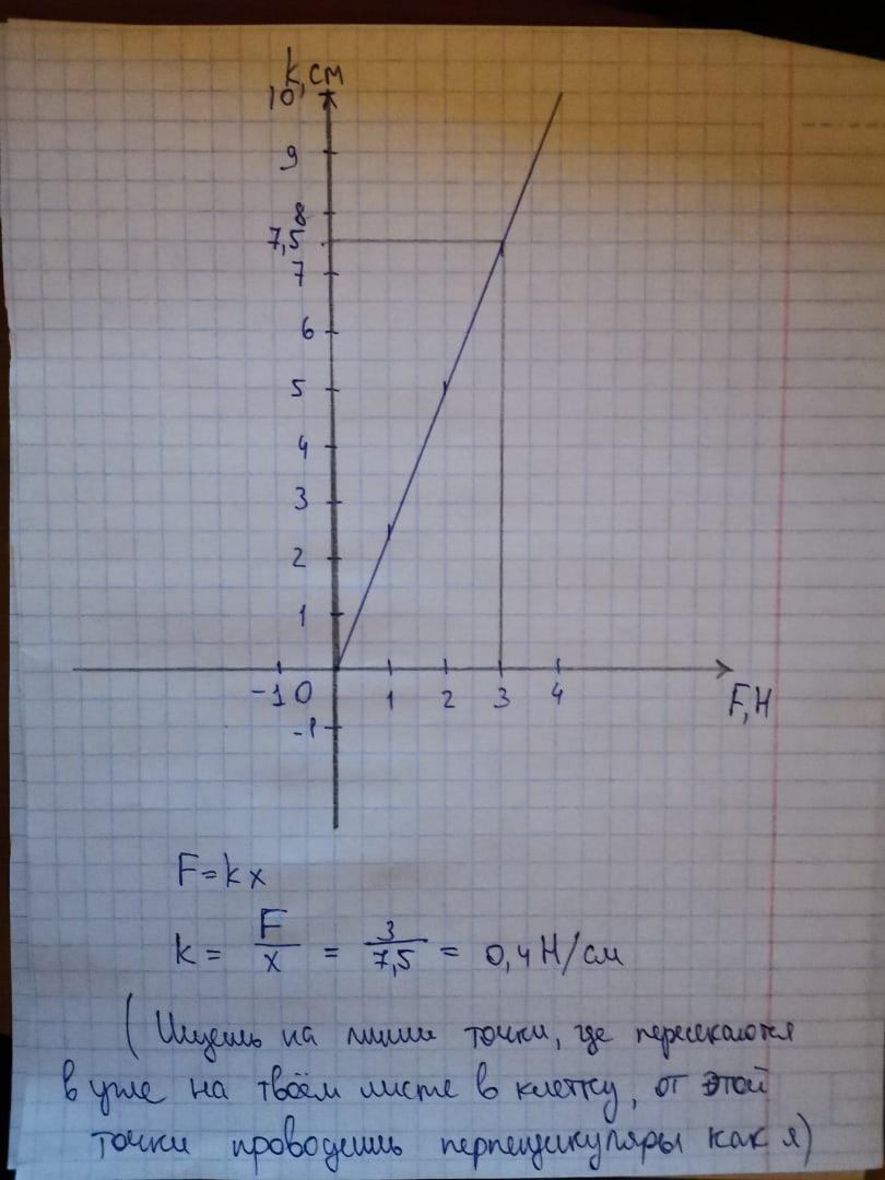 а теперь по поводу графика(это тебе) рисуем прям в точности как у меня, про минусы 1 не забывай, если спросят почему написала - ответишь, что пружину ещё можно и сжимать, поэтому стоят минусы 1 на силе и длине пружины) от2,5 см рисуешь вверх 1мм и вниз 1мм, также как и от 5см, а в третьем случае от 7,5 мм просто рисуешь 2 мм отрезок