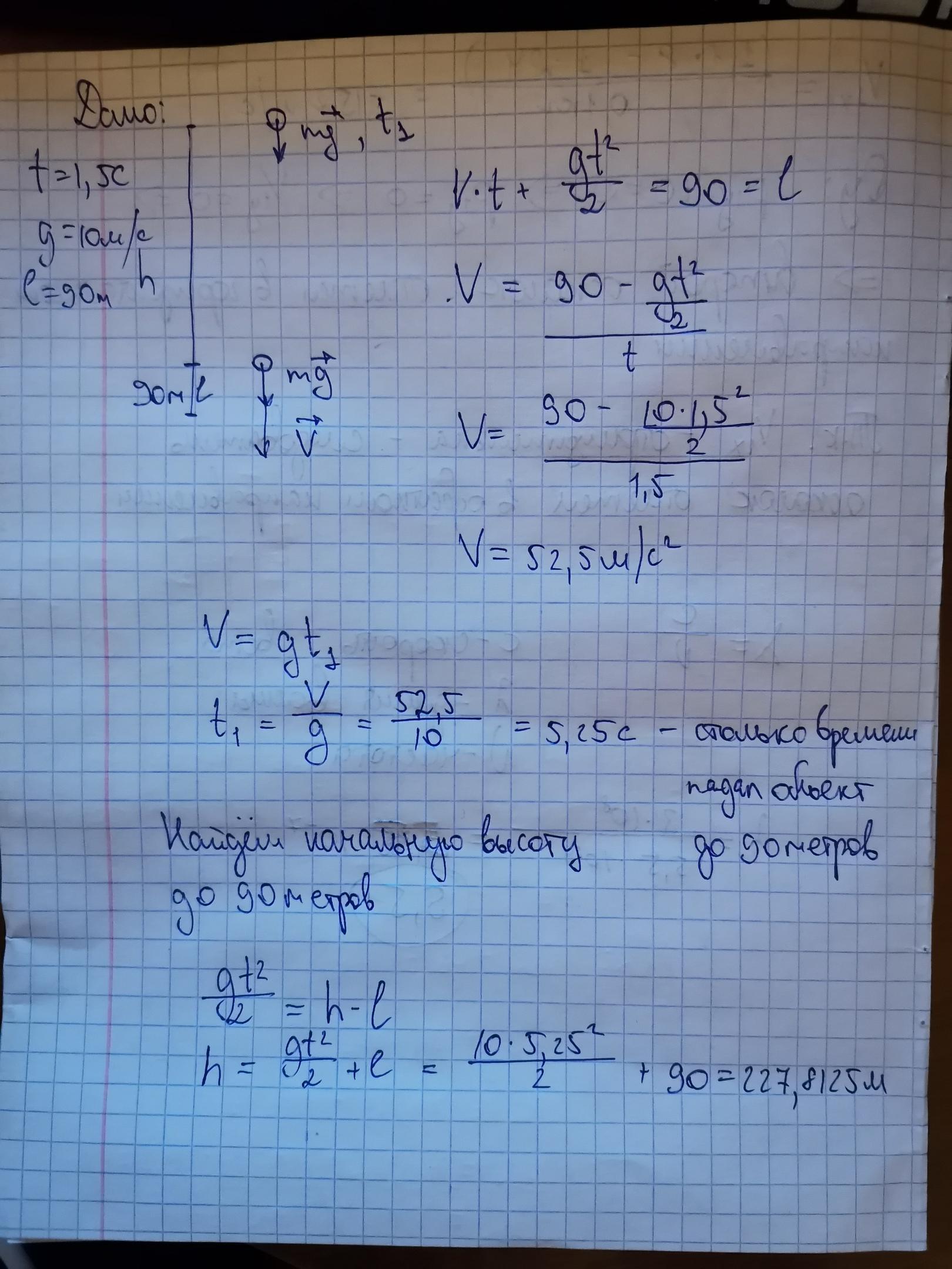 Свободно падающий в поле тяжести шарик пролетел конечный участок траектории длиной 90м за время 1,5с. Найти высоту с которой падал шарик, если его начальная скорость равна нулю. Ответ приведите в метрах . Ускорение свободного падения принять равным 10м/с^2. Силу сопротивления воздуха считайте пренебрежимо малой.
