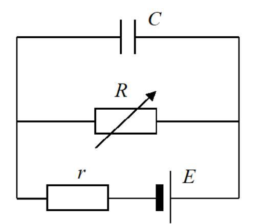 В схеме, приведенной на рисунке, ЭДС источника равна 30В. При первоначальном значении переменного сопротивления R напряжение на конденсаторе было равно 10В. После изменения значения переменного сопротивления, напряжение на конденсаторе оказалось равным 20В. Найти отношение конечного и начального значений переменного сопротивления R