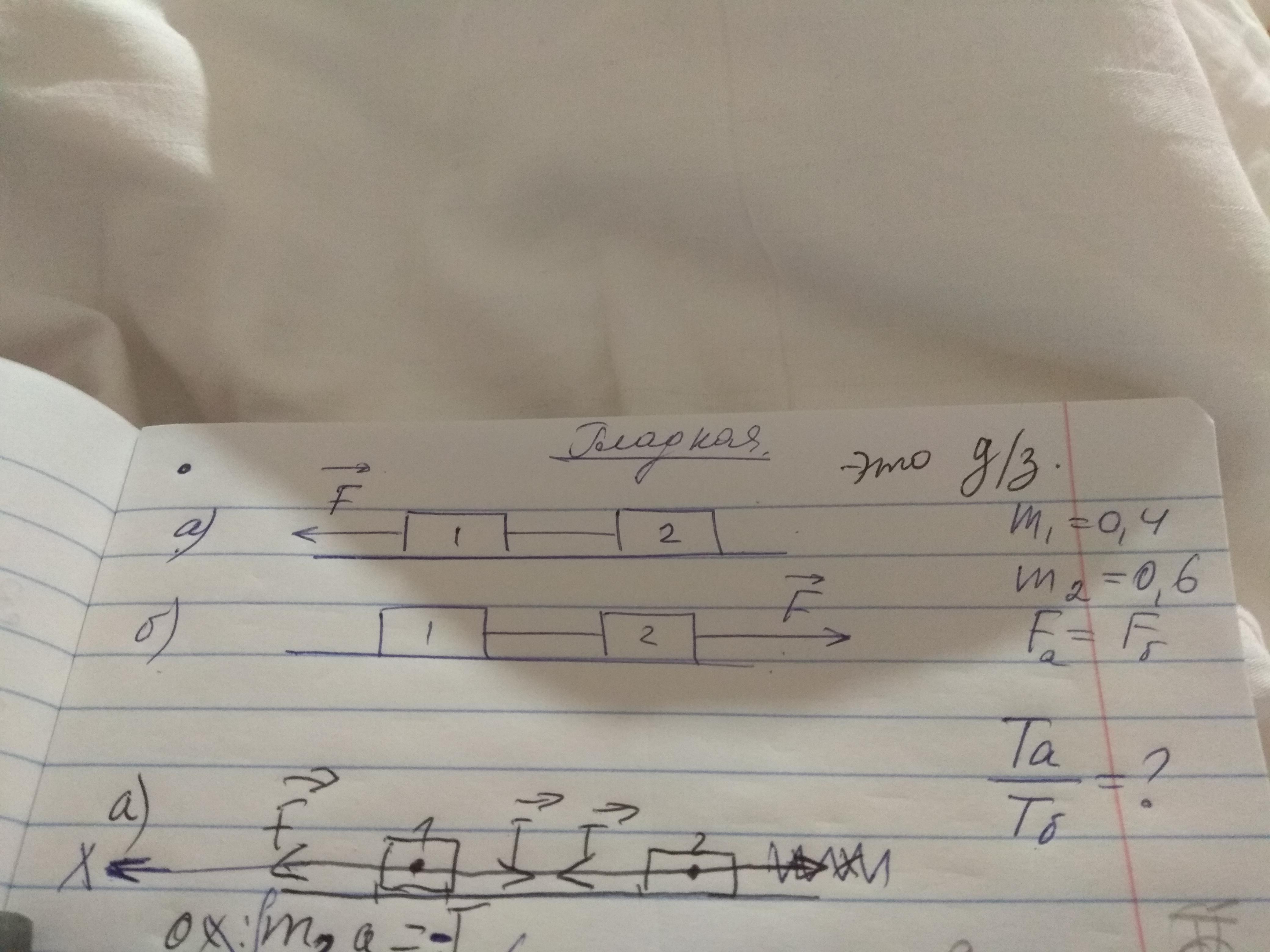 Два груза массами 0,6 и 0,4 лежат на гладкой поверхности при этом f=f найти отношение натяжения нити решите пожалуйста, ничего не получается:(