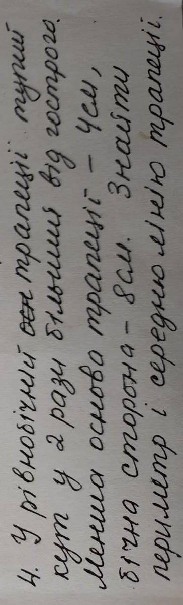 У рівнобічній трапеції тупий кут у два рази більше від гострого меншу основу трапеції 4 см бічна сторона 8 см Знайти периметр і середню лінію трапеції