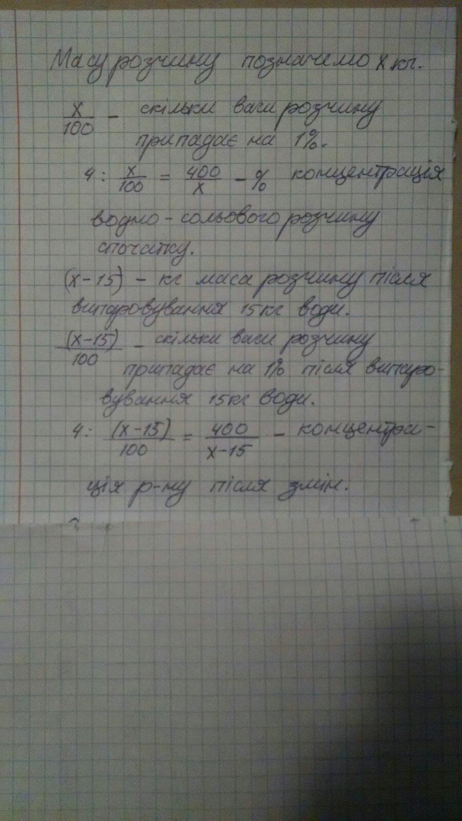 Водно-сольовий розчин містив 4 кг солі. Через деякий час 15 кг води випарувалось,