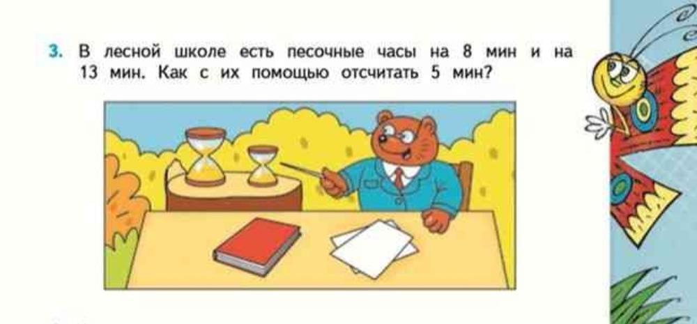 надо сделать чтобы часы перевернулись в двоем одновременно в первых часах кончится песок а во вторых ещё будет запас времени на 5 минут