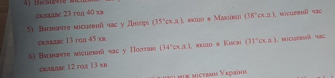 5) надо отнять значения долготы 38-35 = 3° * 4 хв = 12 хвилин, так как Макеевка восточнее Днепра, значит в Днепре времени меньше отнимаем 13 год 45 хв-12 хв= 13 год 33 хв
