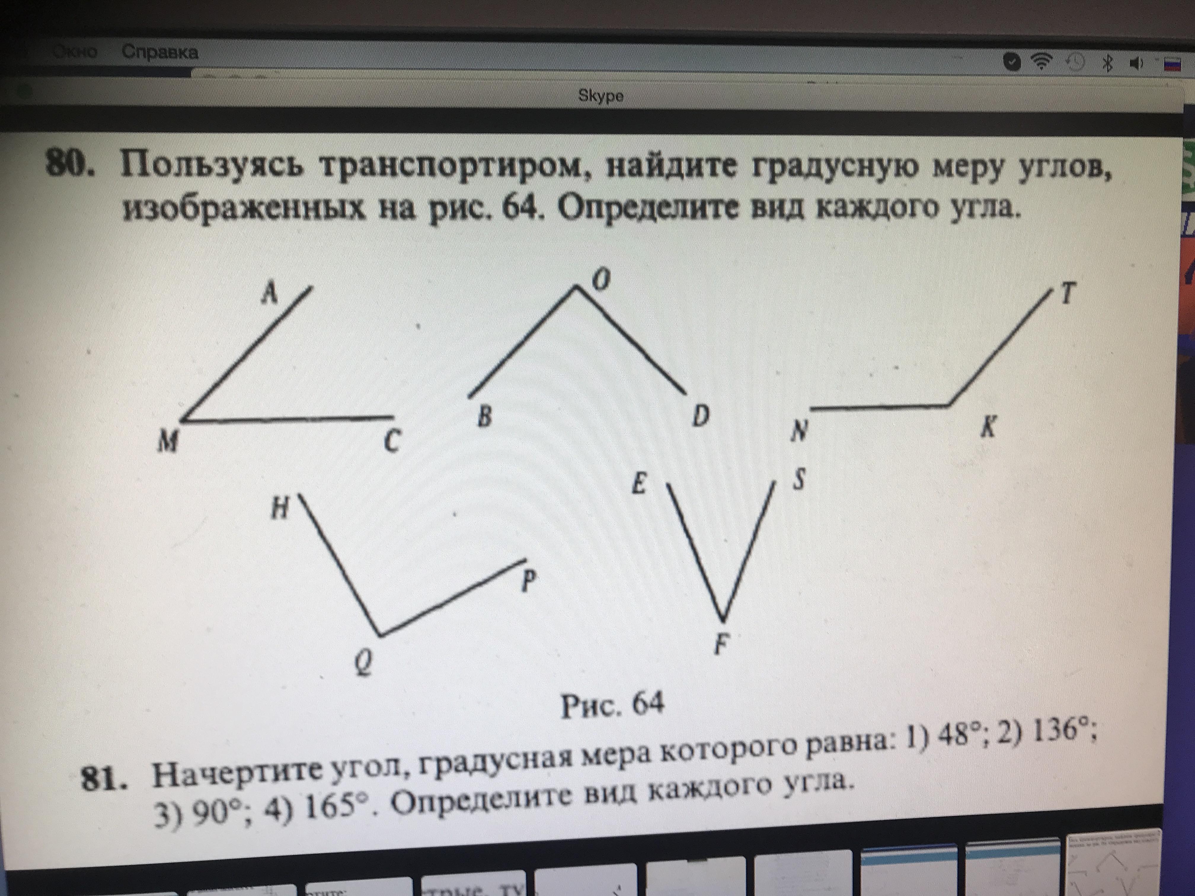 Пользуясь транспортиром найдите градусную меру углов изображённых на рис 64 определите вид каждого угла