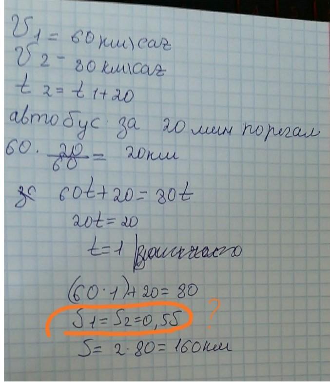 «У нас есть пункт «А» и пункт «В». Из «А» выехал автобус со скоростью 60км/ч, а из «Б» со скоростью 80 км/ч. Автомобиль выехал на 20 минут позже автобуса. Они встретились ровно на половине пути. Длина пути?»