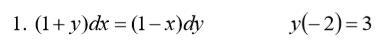 dx/(1-x)=dy/(1+y), или d(1+y)/(1+y)=-d(1-x)/(1-x). Интегрируя обе части, получаем: ln/1+y/=-ln/1-x/+ln/C/, где C - любое отличное от нуля число. Отсюда 1+y=C/(1-x). Используя условие y(-2)=3, приходим к уравнению 1+3=C/(1+2), откуда находим C=12. Поэтому искомое частное решение таково: 1+y=12/(1-x), или y=12/(1-x)-1.