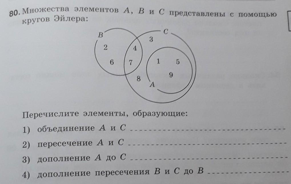 4) Тут добавили к множеству B пересечение B и C, это странно поэтому чтоб вы поняли рассмотрим дополнительный пример: дополнение пересечения A и C до B. Тут ответ это 2,6,7,4,1,9,5 так как мы к множеству B, добавили все элементы которые одновременно в множестве A и множестве C