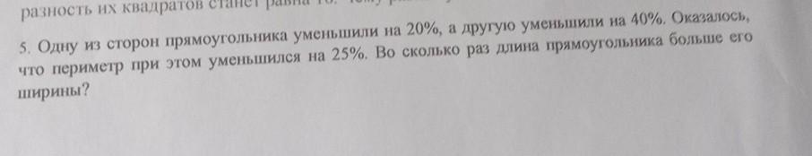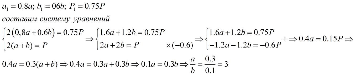 Был периметр 2(a+b); Стал периметр 2(0,8a+0.6b). значит, (0.8a+0.6b)=0.75(a+b); 0.05a=0.15b; a= 3b. Ответ: В 3 раза.