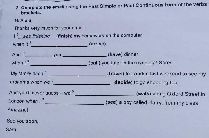 1. arrived 2. were you having 3. called 4.travelled 5. decided 6. were walking 7. saw