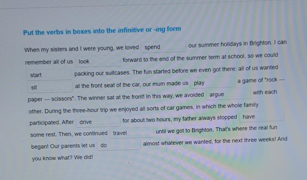 1)spending 2)looking 3)start 4)to sit 5)play 6)arguing 7)driving 8)to have 9)traveling 10)do