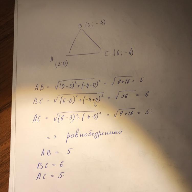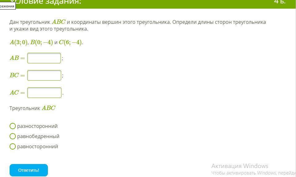 Дан треугольник ABC и координаты вершин этого треугольника. Определи длины сторон треугольника и укажи вид этого треугольника.
