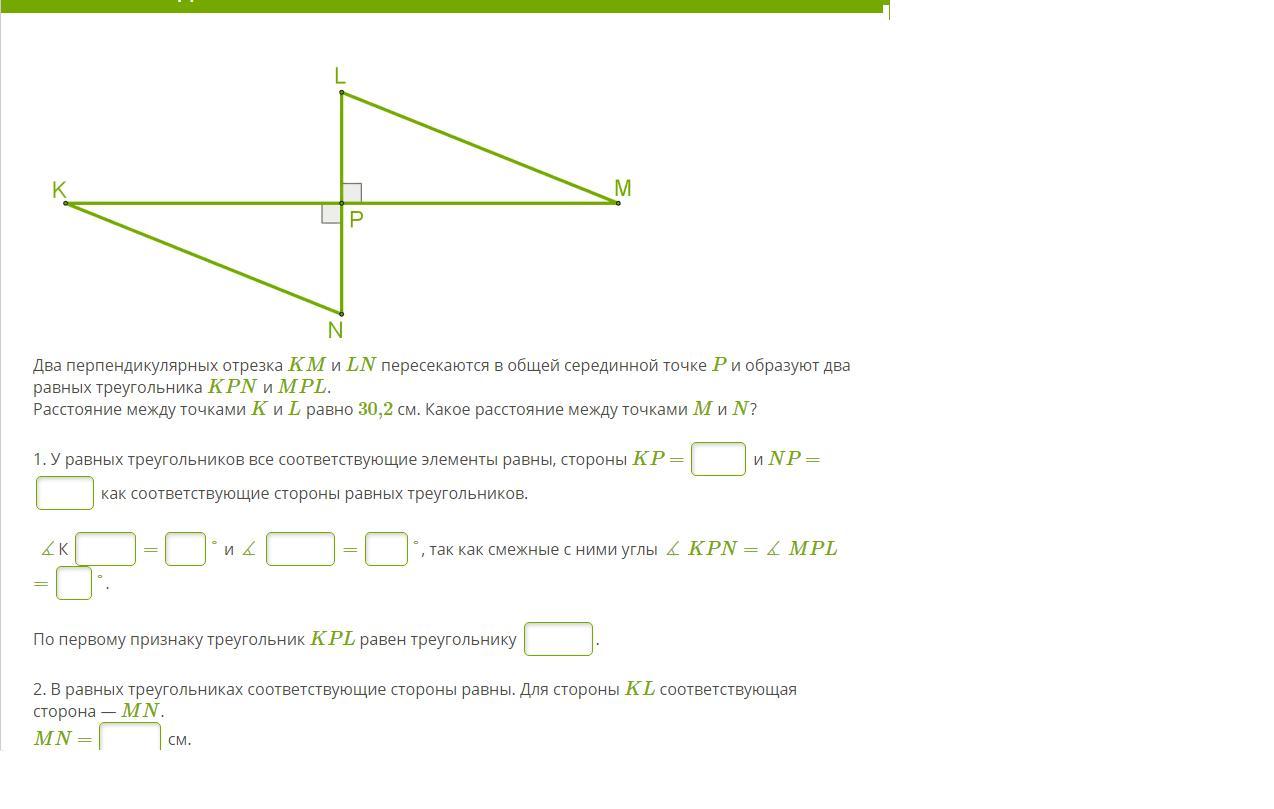 1. У равных треугольников все соответствующие элементы равны, сторон KP = MP и NP = PL как соответствующие стороны равных треугольников.