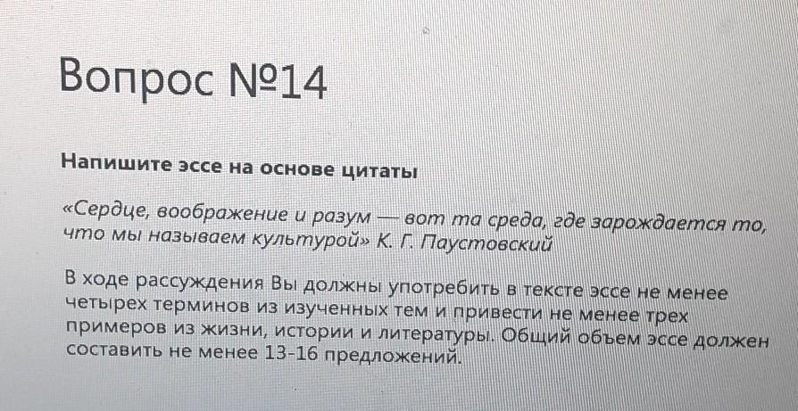 Я согласна с высказыванием великого русского писателя К. Г. Паустовского “Сердце,воображение и разум – вот та среда,где зарождается то, что мы называем культурой”. На самом деле наше сердце, воображение и разум создали культуру, все наши мысли, чувства мы рассказываем через стихи, картины и т. п. Без нашей души, не было бы такой высокой культуры. Воображение человека внесло огромный вклад в историю культуры, с его помощью люди возводили величайшие сооружения, рисовали картины, писали стихи, которые до сих пор восхищают людей. Так же, культура, живет в нашем сердце, ее можно назвать нашими традициями, которые восхищают многие страны мира.