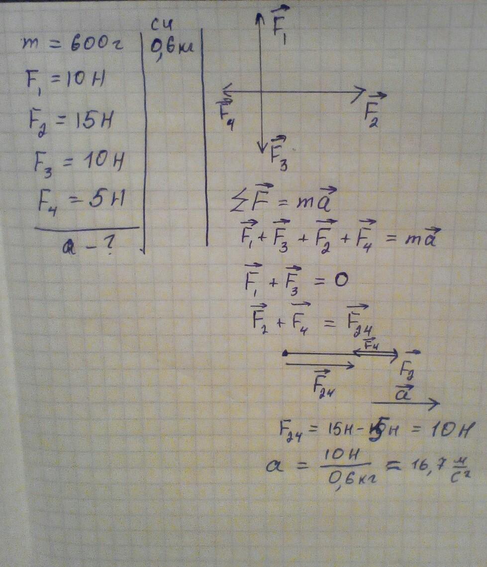 известно, что масса этого тела 600 г, а величины сил соответственно равны