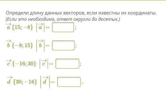 1)a(15;-8)\\\\|a|=\sqrt{15^{2}+(-8)^{2}} =\sqrt{225+64}=\sqrt{289} =17\\\\\\2)b(-8;15)\\\\|b|=\sqrt{(-8)^{2}+15^{2}} =\sqrt{64+225}=\sqrt{289}=17\\\\\\3)c(-16;30)\\\\|c|=\sqrt{(-16)^{2}+30^{2}}=\sqrt{256+900}=\sqrt{1156}=34\\\\\\d(30;-16)\\\\|d|=\sqrt{30^{2}+(-6)^{2}}=\sqrt{900+256}=\sqrt{1156}=34