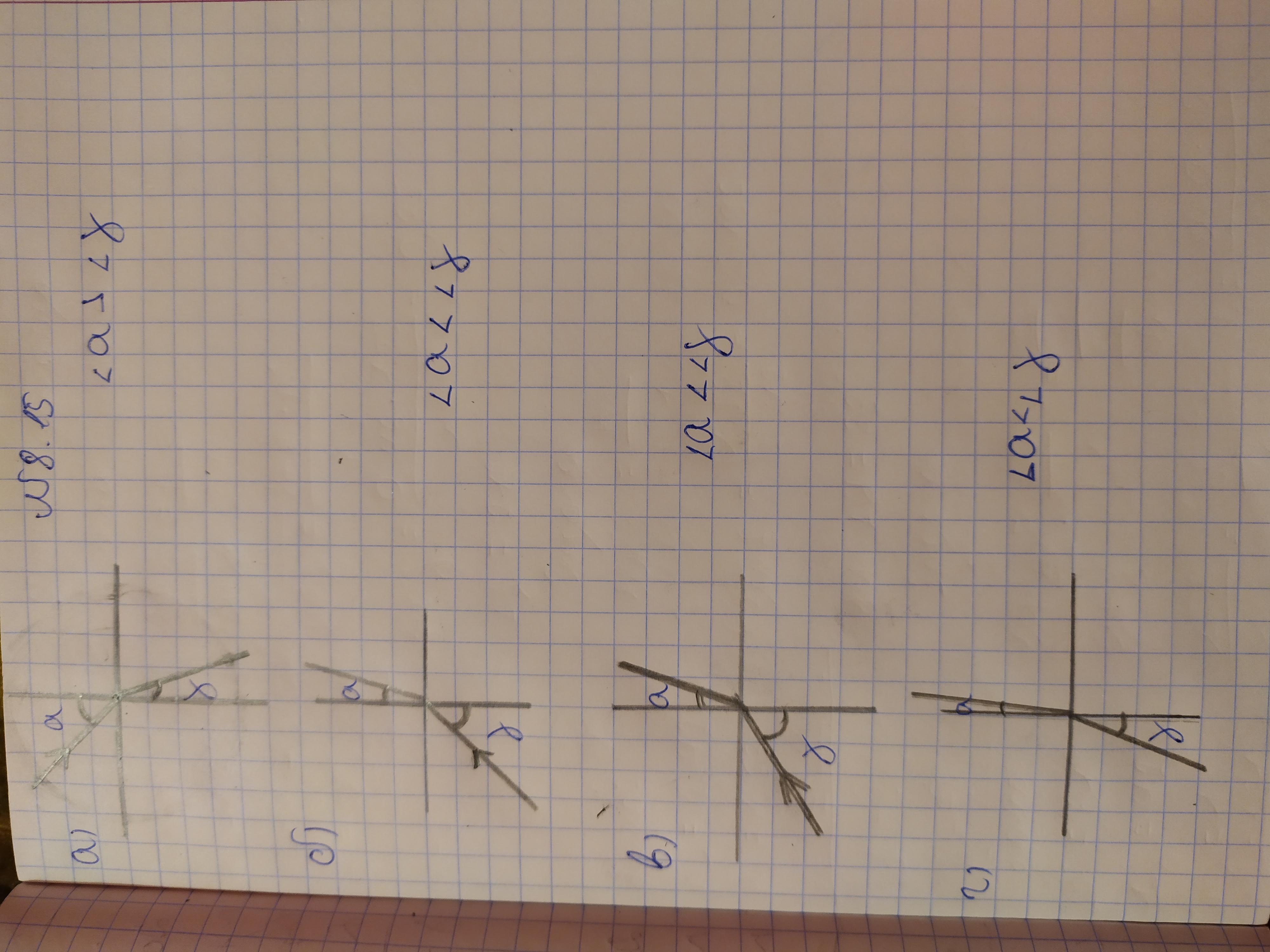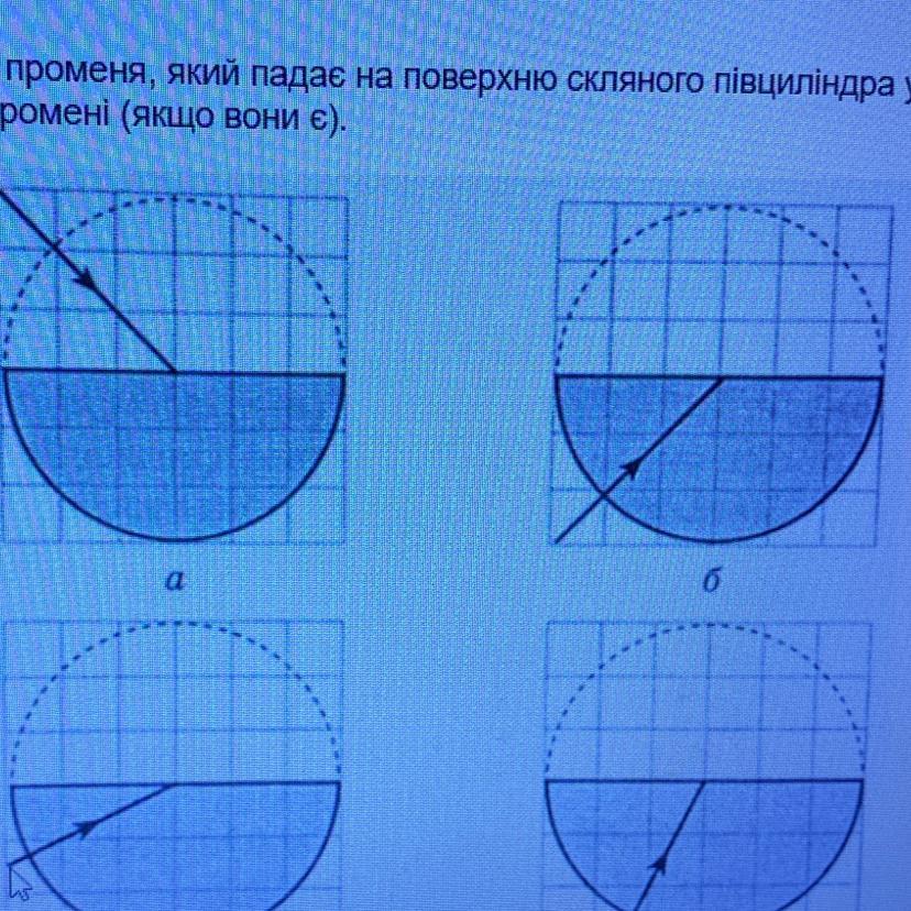 Побудуйте подальший хід світлового променя, який падає на поверхню скляного півциліндра у випадках а-г (див. рисунок).
