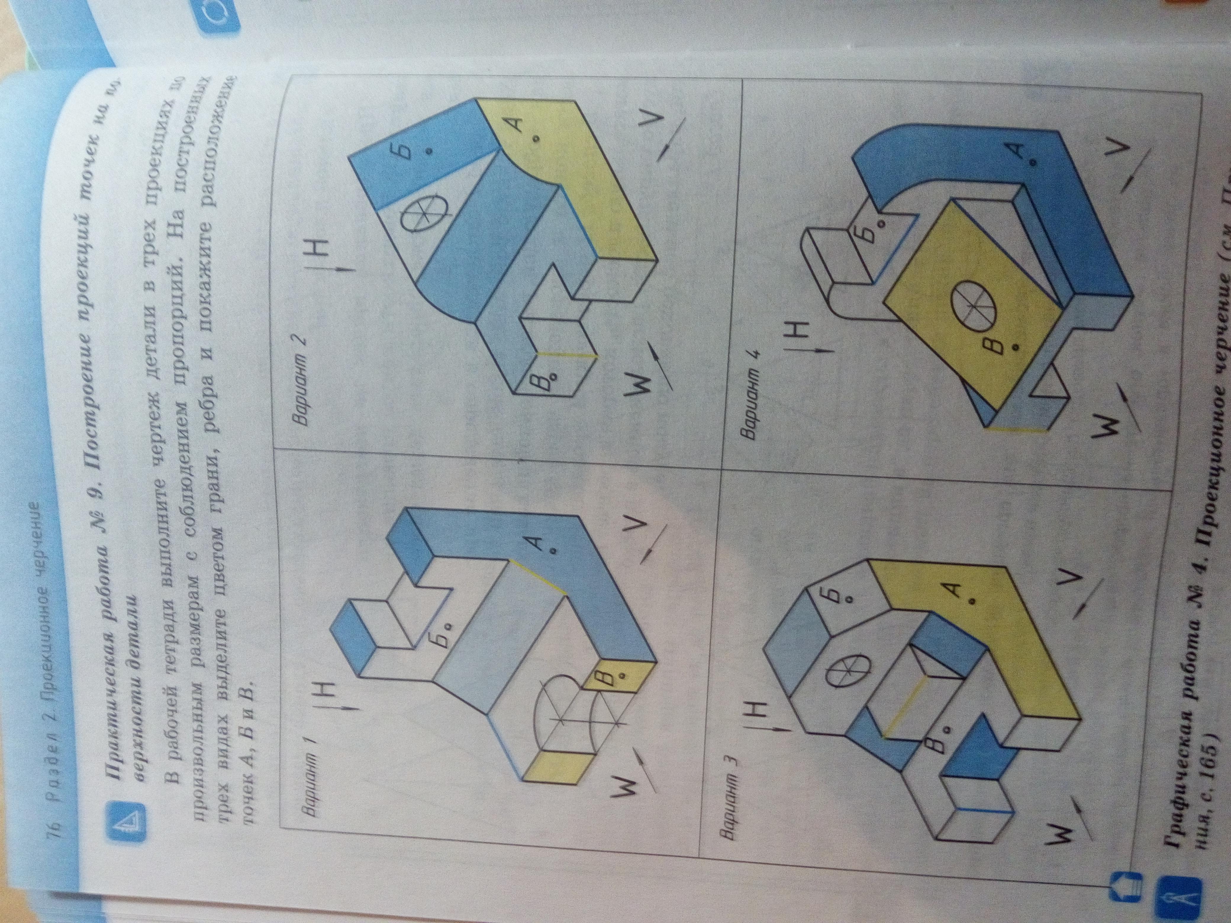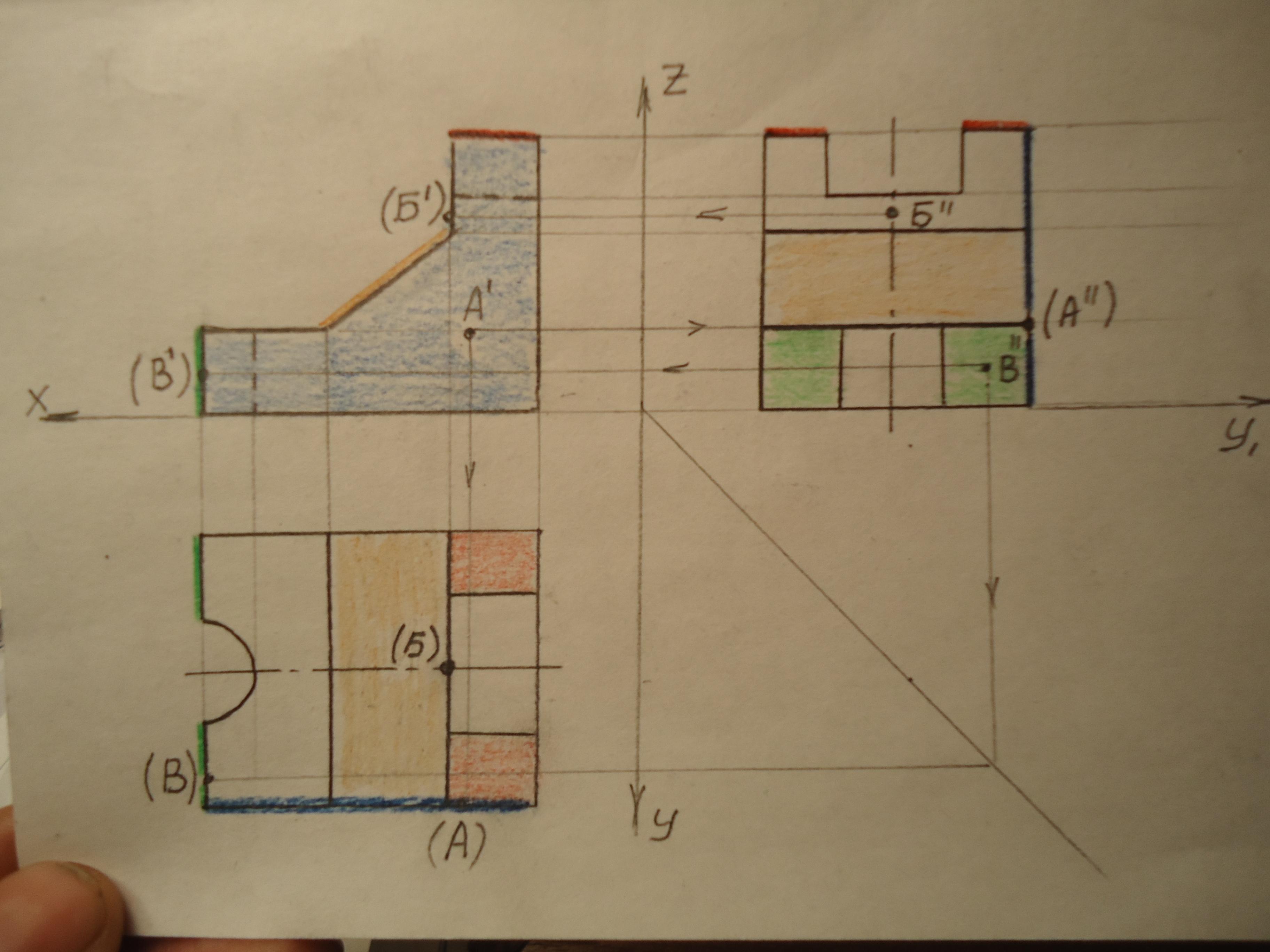 Построение чертежа, нахождение проекций точек и закрашивание необходимых граней и рёбер на чертеже см. на фото №2.