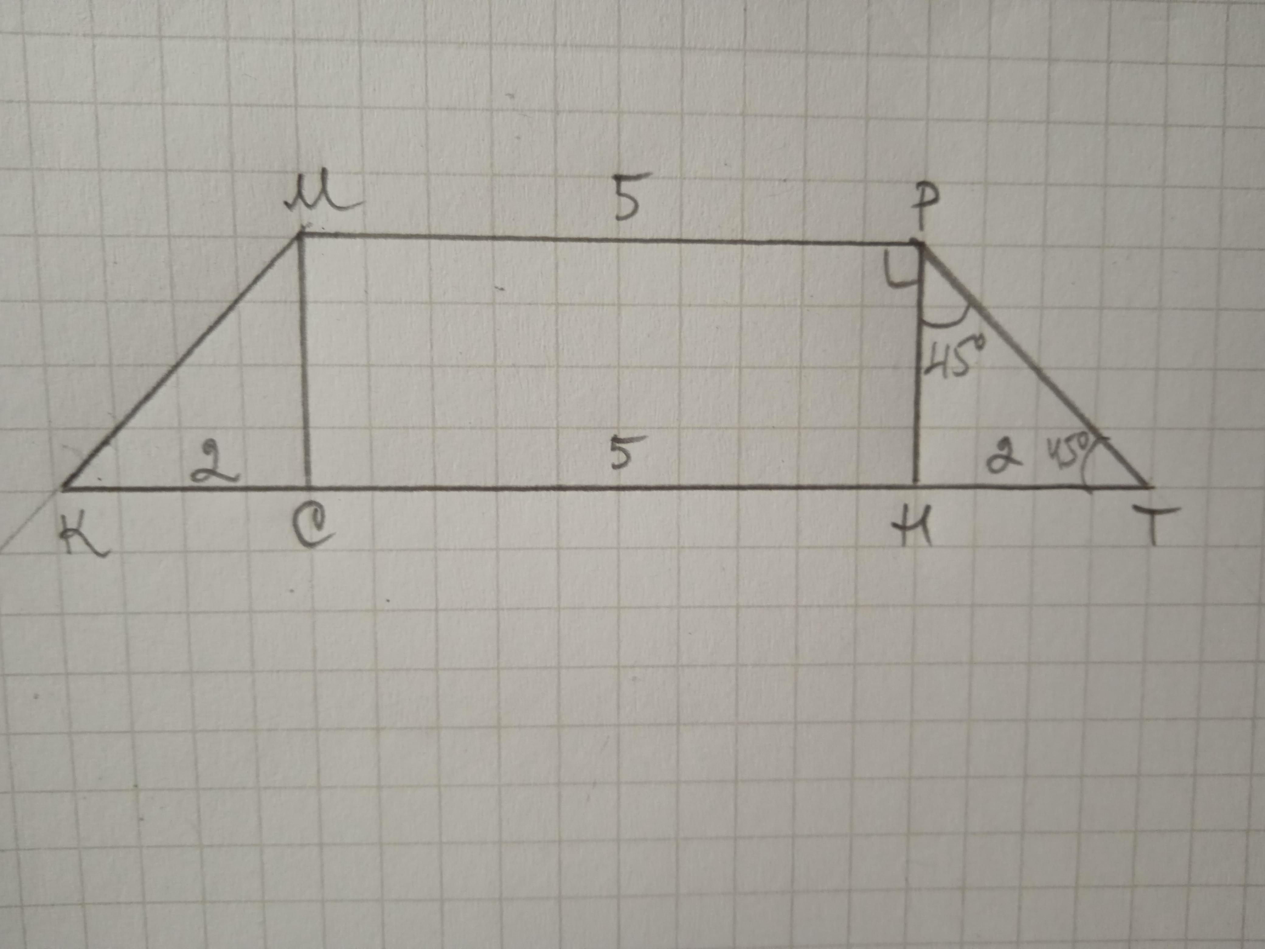 Дано: КМРТ - трапеція, КМ=РТ, МР=5 см, КТ=9 см, ∠МРТ=135°. Знайти РН.