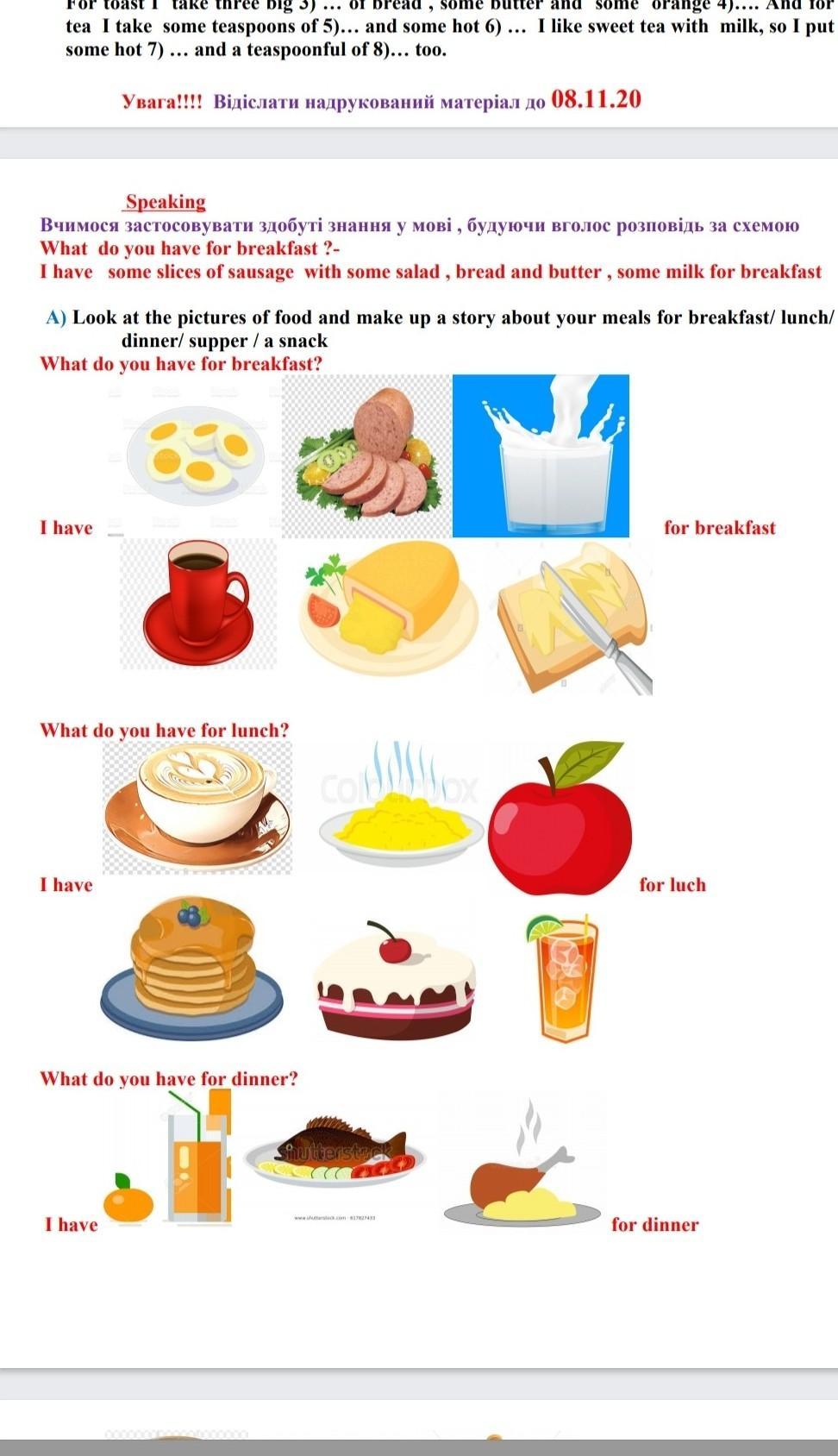 For breakast I usually have tea with butter and 3 eggs. For lunch I usually have some cakes an appel. And for boner I have meat and juse