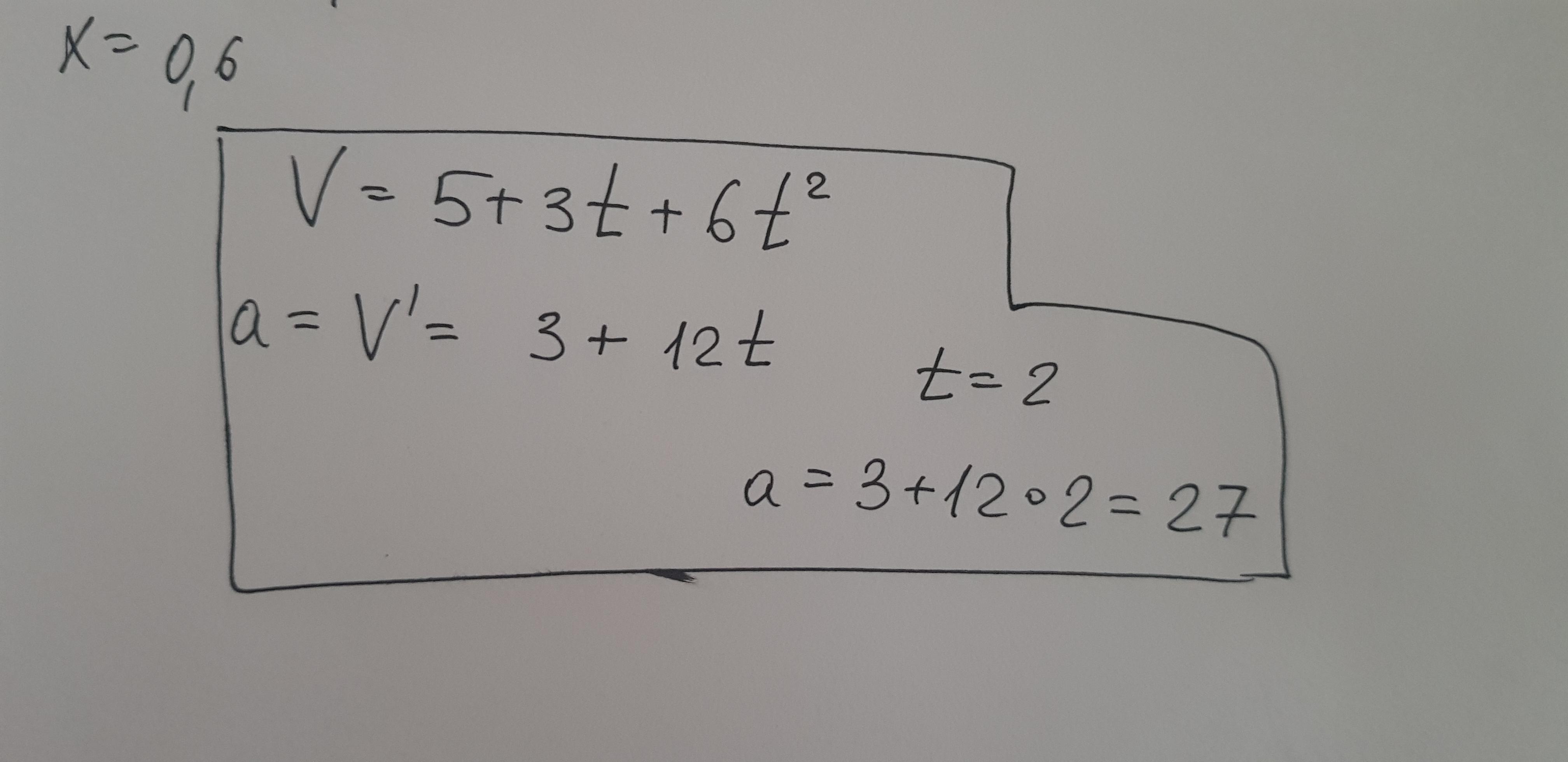 Тело совершает прямолинейное движение со скоростью v=5+3t+6t^2 . Найти ускорение движения в конце второй секунды.