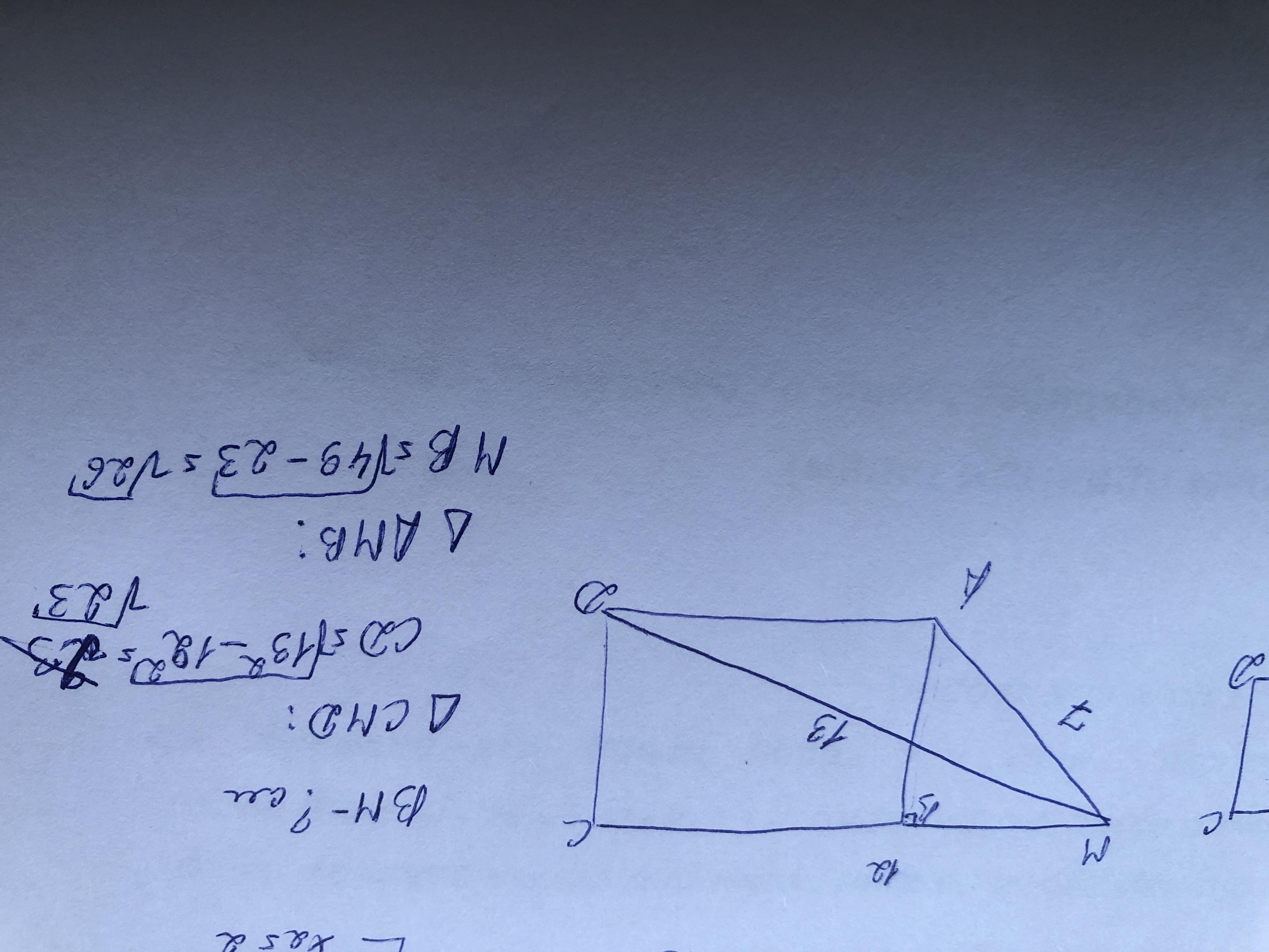 Через вершину B прямоугольника ABCD проведён перпендикуляр BM к его плоскости. Известно, что AM=7 см, CM=12 см, DM=13 см. Найдите расстояние от точки M плоскости прямоугольника