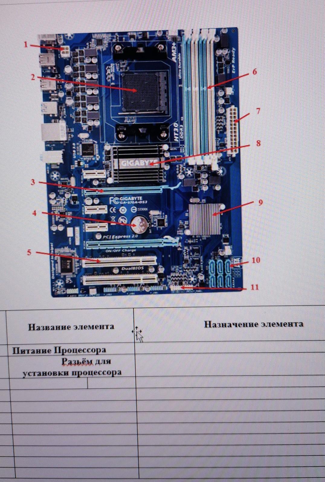 Перед вами материнская плата на картинке. Надо написать название элемента где красные стрелки и назначение
