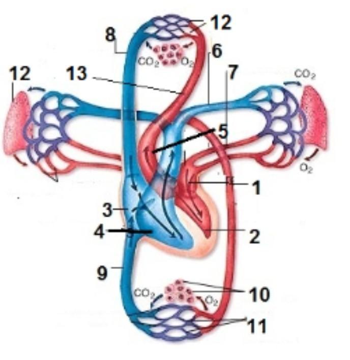 Большой круг кровообращения: 3, 4, 5, 8, 9, 10, 11, 13